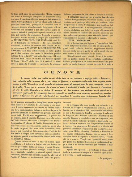 La rinnovata libertà di stampa permette la pubblicazione di scritti fino ad allora destinati alla sola circolazione clandestina. In questo esempio l'ex partigiano chiavarese Giovanni Sebardini "Bini", propone su «Genova. Rivista del Comune» (anno XXV, n. 1, dic. 1945, pp. 6-7), la riedizione di un articolo uscito nell'agosto 1944 sul primo numero del periodico clandestino «Il Partigiano».