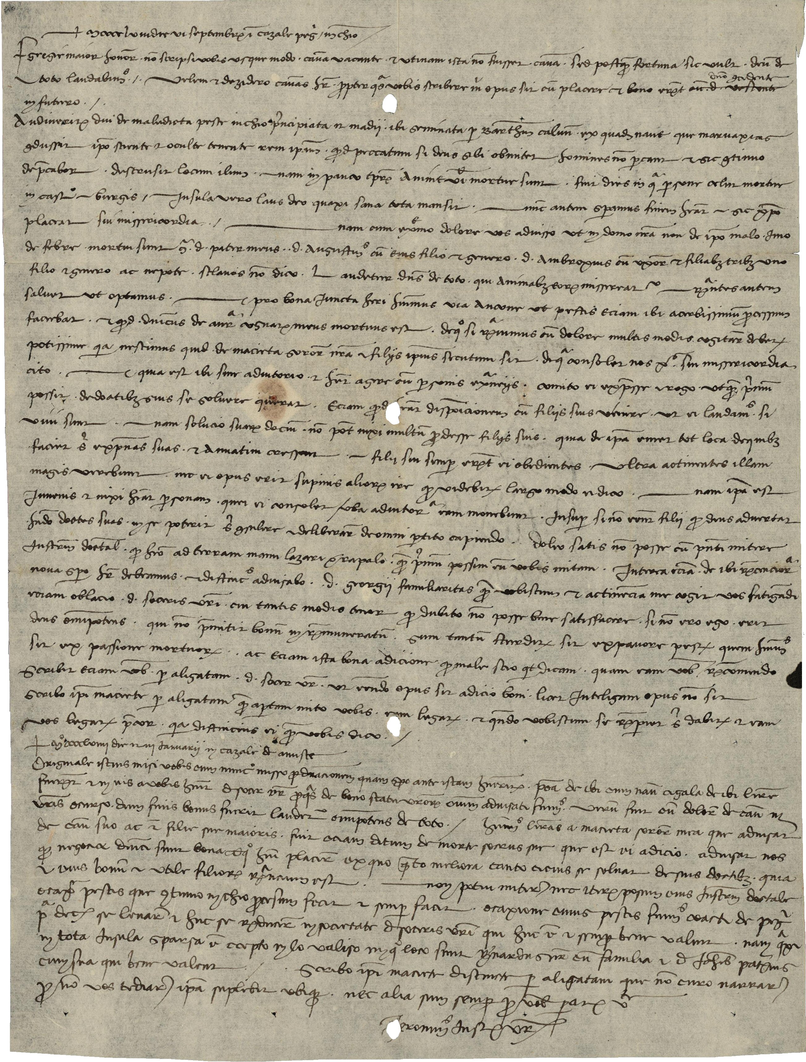 «6 settembre 1458, Pyrghi (Chio) A Giorgio Giustiniani fu Andreolo, Genova Vorrei potervi scrivere solo per piacere e con buone notizie e così sarà in futuro, se Dio vorrà. Ormai avrete saputo della maledetta peste che ha avuto inizio a Chio il 20 maggio, seminata dalla nave di Bartolomeo Calvo che ha portato un carico di malvasia, ben sapendo di avere a bordo il contagio, che ha tenuto nascosto: e se Dio dovesse perdonargli questo peccato, non lo facciano gli uomini, e per questo pregherò sempre. La peste ha distrutto questo luogo, infatti in poco tempo sono morte 6000 persone: in un solo giorno ne sono morte 280 nel castrum e nei borghi, mentre l’isola, per grazia di Dio, è rimasta quasi del tutto sana. Con estremo dolore vi informo che nella nostra casa – non per la malattia ma di febbre – sono morti mio padre, Agostino con suo figlio e suo genero, Ambrogio con la moglie e tre figlie, un figlio ed il nipote, non vi dico quanti schiavi. Lodiamo di tutto Iddio, che abbia pietà delle loro anime. Per giunta ieri ho avuto notizia che la peste infuria anche a Genova e che mio cognato Domenico Doria è morto. Ve lo riferisco con vero dolore, tanto più che non so cosa ne sia di mia sorella Macietta e dei suoi figli, e prego Gesù Cristo di venirmi in aiuto con la sua misericordia. Poiché Macietta si trova a Genova senza aiuti e tra estranei vi prego di prendervene cura perché chieda al più presto il pagamento della sua dote. In questo modo potrà provvedere ai suoi figli, investendo il denaro in titoli di San Giorgio che le permetteranno di far fronte alle spese e accumuleranno interessi anno per anno. Così i figli le saranno obbedienti, i congiunti avranno maggior rispetto di lei e non sarà costretta a sottostare ad altri. Macietta infatti è giovane e, se – Dio non voglia! – non le fossero rimasti figli, avendo la sua dote potrà decidere da sola de omni partito capiendo. Sono addolorato di non poter inviare a Genova il suo atto dotale, che conservo nella città di Chio; ve lo invierò appena possibile. Scrivo a Macietta una lettera che lascio aperta perché possiate leggerla prima di consegnarla. La familiarità che ho con voi mi spinge ad accollarvi quest’onere; quanto a vostro suocero, il debito che ho nei suoi confronti è tale che dubito di poterlo mai ripagare, e prego che lo faccia Dio, che non permette che la bontà rimanga senza ricompensa. Sono così stordito per la paura della peste e il dolore per i morti che non so nemmeno quello che dico. Vi raccomando mia sorella».