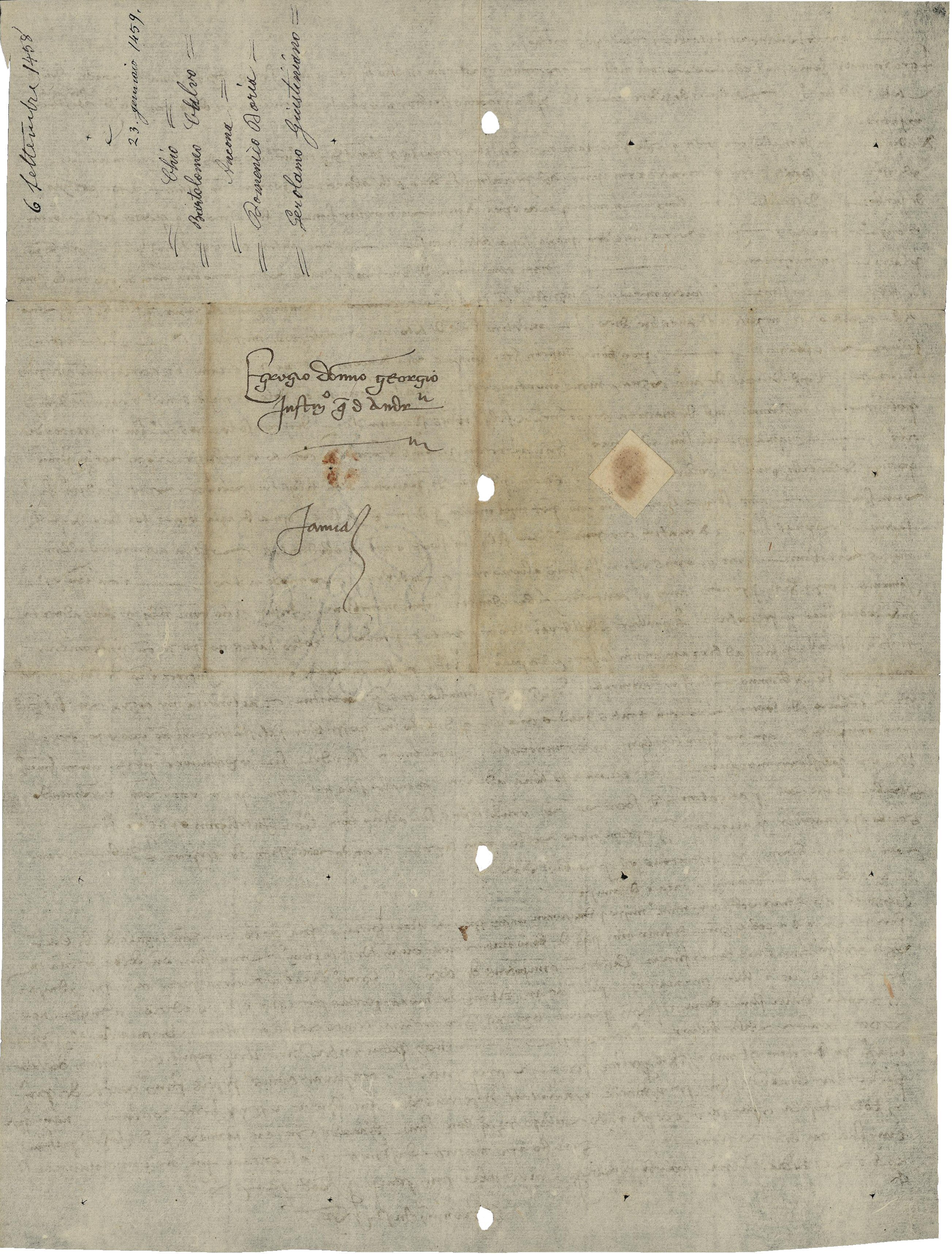 1458, settembre 6 – 1459, gennaio 23, Chio Girolamo Giustiniani comunica a Giorgio Giustiniani fu Andreolo, a Genova, le notizie sull’epidemia di peste scoppiata nell’isola di Chio e gli raccomanda gli interessi della sorella Macietta, che a seguito della morte del marito deve rientrare in possesso della sua dote.