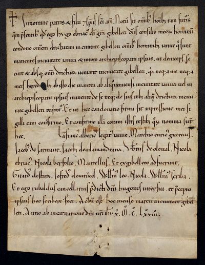 ![]() | 1168, marzo, Gibelletto Ugo Embriaco, signore di Gibelletto, concede ai genovesi l’esenzione da ogni imposizione doganale in Gibelletto. |