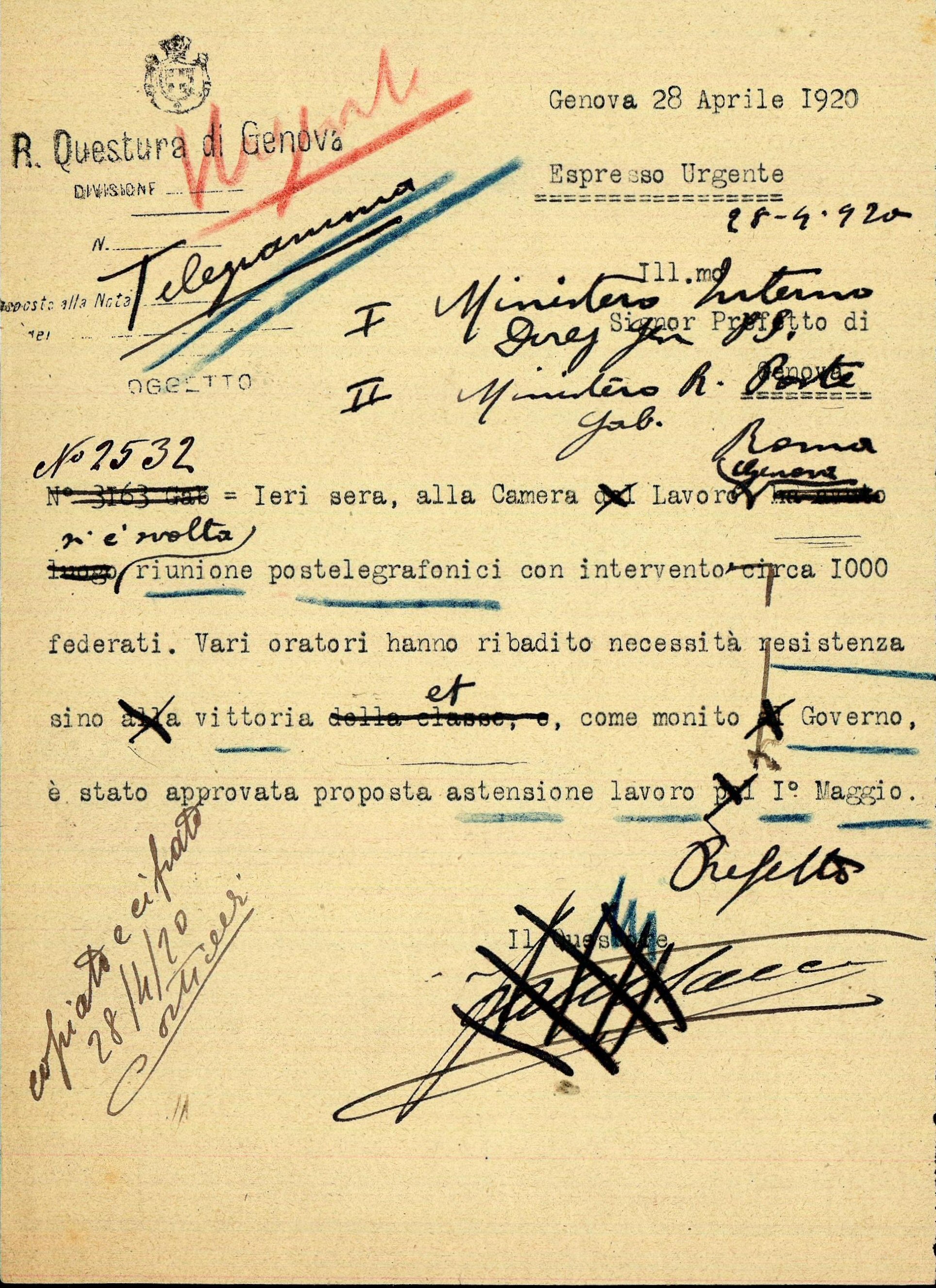 Telegramma Ministero Interno Ministero R. Poste N. 2532 = Ieri sera, alla Camera Lavoro Genova si è svolta riunione postelegrafonici con intervento circa 1000 federati. Vari oratori hanno ribadito necessità resistenza sino vittoria et, come monito Governo, è stata approvata proposta astensione lavoro I° maggio. | ![]() |