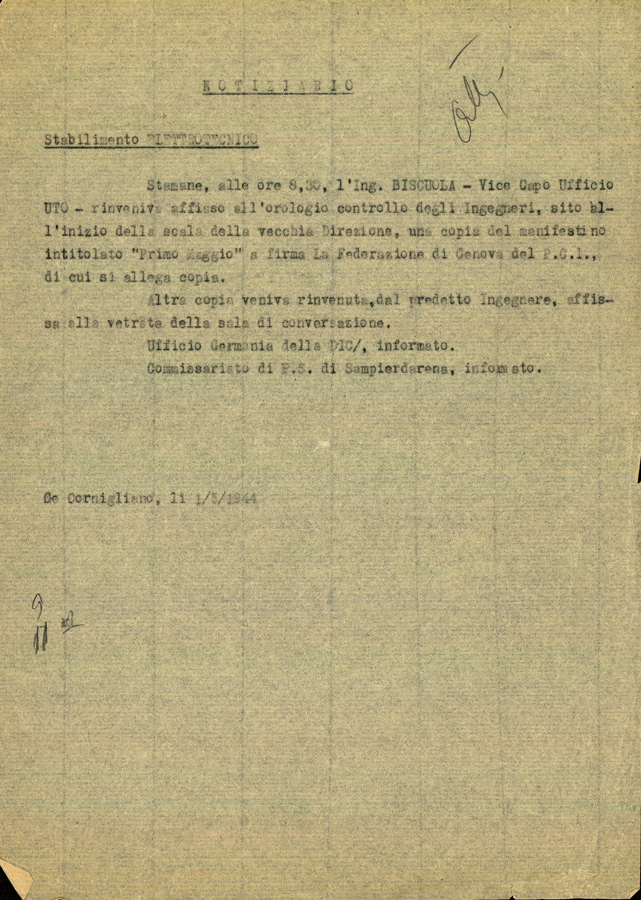 NOTIZIARIO Stabilimento ELETTROTECNICO Stamane, alle ore 8,30, l’ing. BISCUOLA – Vice Capo Ufficio UTO – rinveniva affisso all’orologio controllo degli ingegneri, sito all’inizio della scala della vecchia Direzione, una copia del manifestino intitolato “Primo Maggio” a firma la Federazione di Genova del P.C.I., di cui si allega copia. Ufficio Germania della DIC/, informato. Ge Cornigliano, li 1/5/1944 |