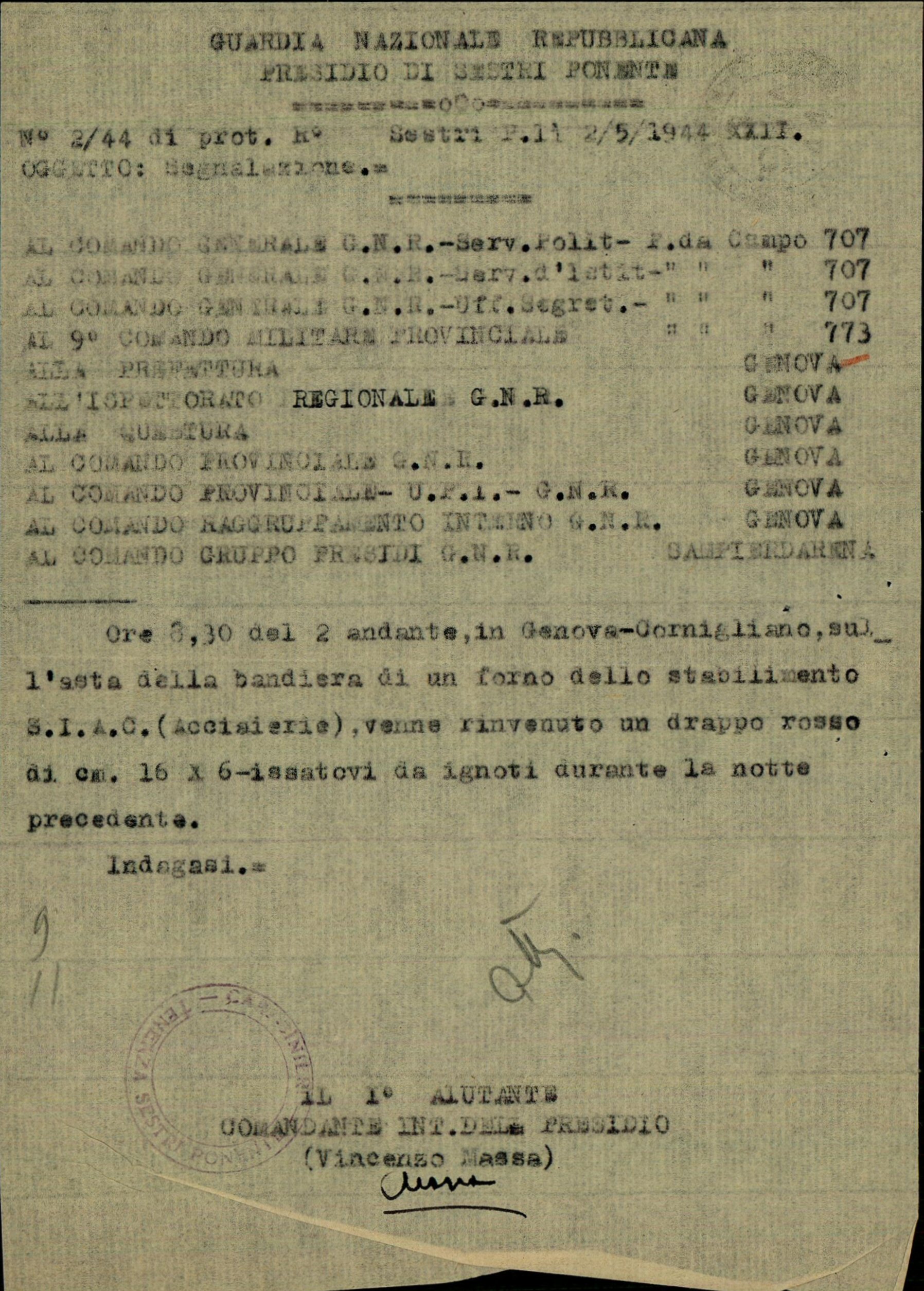 AS GE, Prefettura di Genova, Gabinetto 1943-1945, b. 35, fasc. 12 | GUARDIA NAZIONALE REPUBBLICANA N.9/8 di prot. Div. Ris. Sampierdarena, li I maggio 1944 Oggetto: Segnalazione Al comando generale della G.N.R. Ufficio Segreteria P.d.C.707 Ore 12,30 I maggio corrente, in Genova Bolzaneto, località Brasile pattuglia militari dell’Esercito Repubblicano scorgevano appeso a un palo elettrico di alta tensione drappo rosso, che veniva dai medesimi subito tolto. Il I° aiutante comandante INT. |