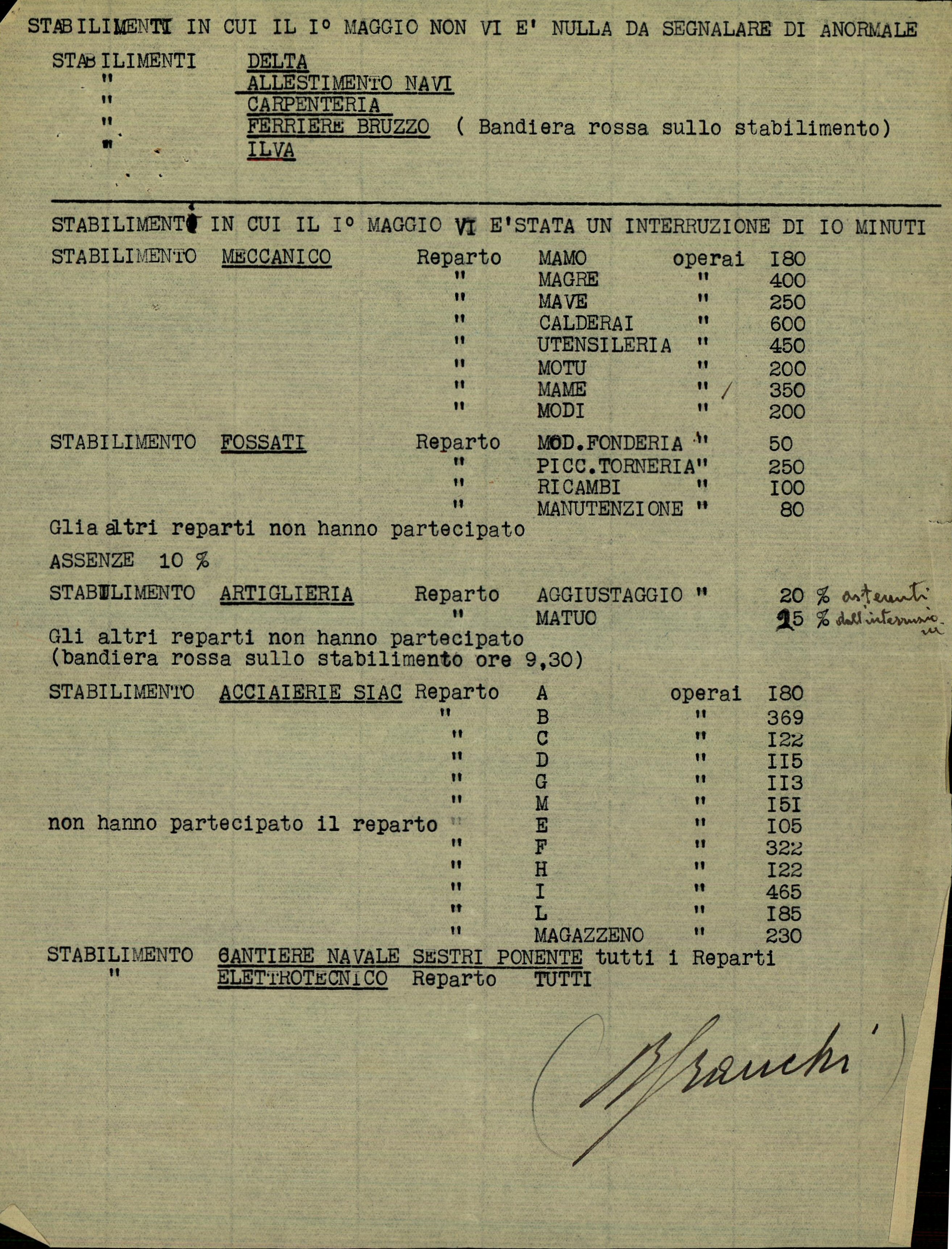 AS GE, Prefettura di Genova, Gabinetto 1943-1945, b. 35, fasc. 12 | STABILIMENTI IN CUI IL I° MAGGIO NON VI E’ NULLA DA SEGNALARE DI ANORMALE STABILIMENTI DELTA Stabilimenti in cui il I° maggio vi è stata un’interruzione di 10 minuti Stabilimento meccanico reparto Mamo operai 180 Stabilimento Fossati reparto Mod. Fonderia operai 50 Gli altri reparti non hanno partecipato Stabilimento artiglieria reparto Aggiustaggio operai 20% astenuti Stabilimento acciaierie Siac reparto A operai 180 Stabilimento Cantiere navale Sestri Ponente tutti i reparti Stabilimento Elettrotecnico reparto TUTTI B. Franchi