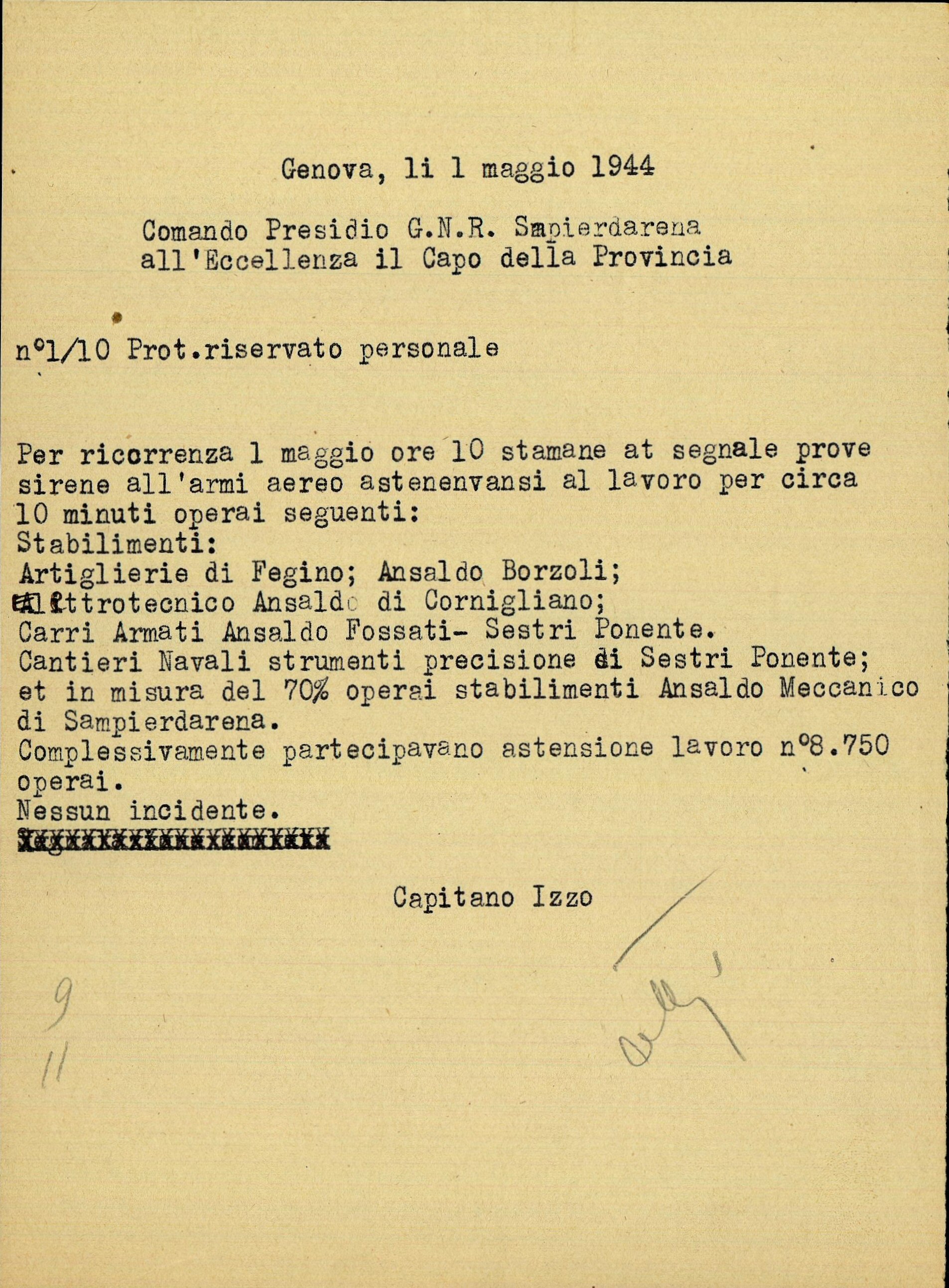Questura Repubblicana di Genova Genova 1/5/1944 XXII° Telegramma Scritto a mano: Ministero Interno Gabinetto Capo Provincia Genova Ore 10 stamane parte o tutte maestranze sottonotati stabilimenti industriali hanno sospeso lavoro quale manifestazione politica ricorrenza primo maggio: “Artiglieria Ansaldo” – sospensione totale dalle 10 alle 10,5; C. E. Basile |