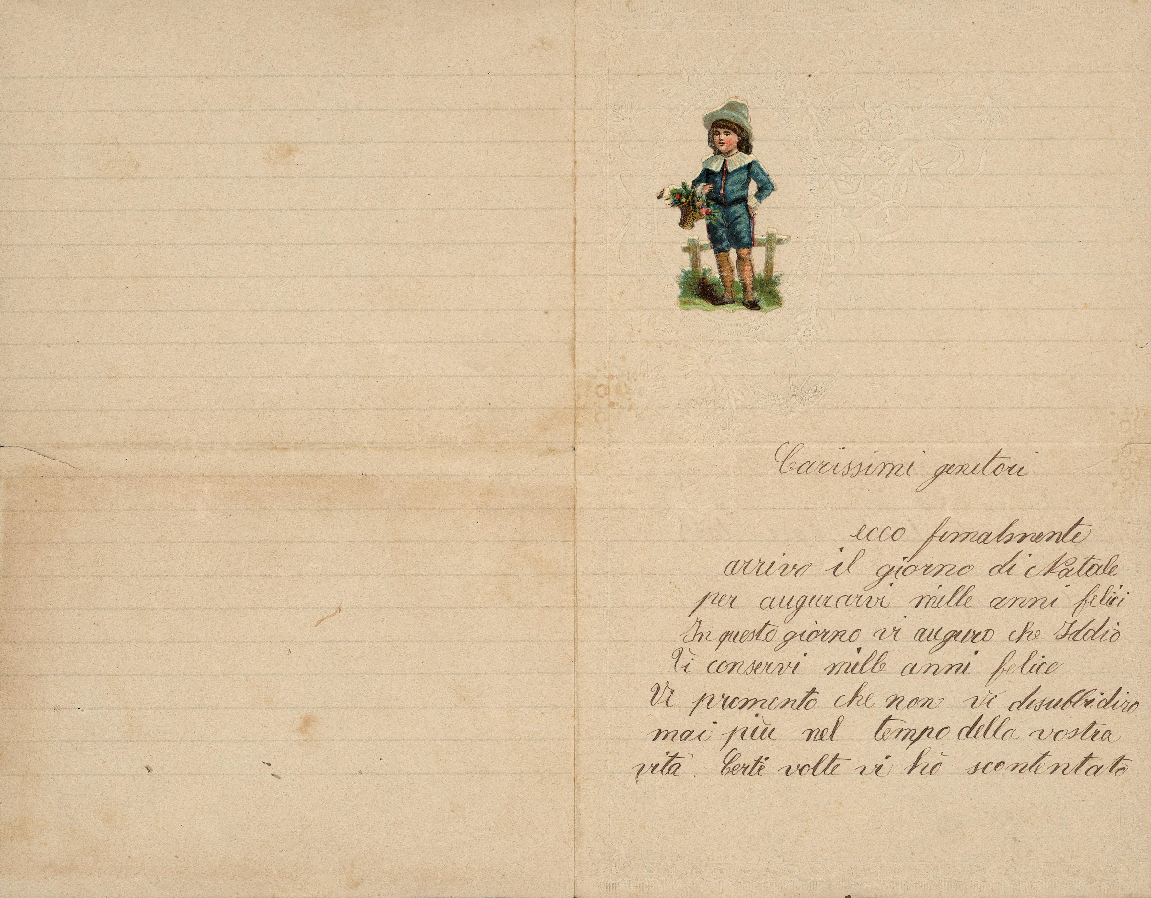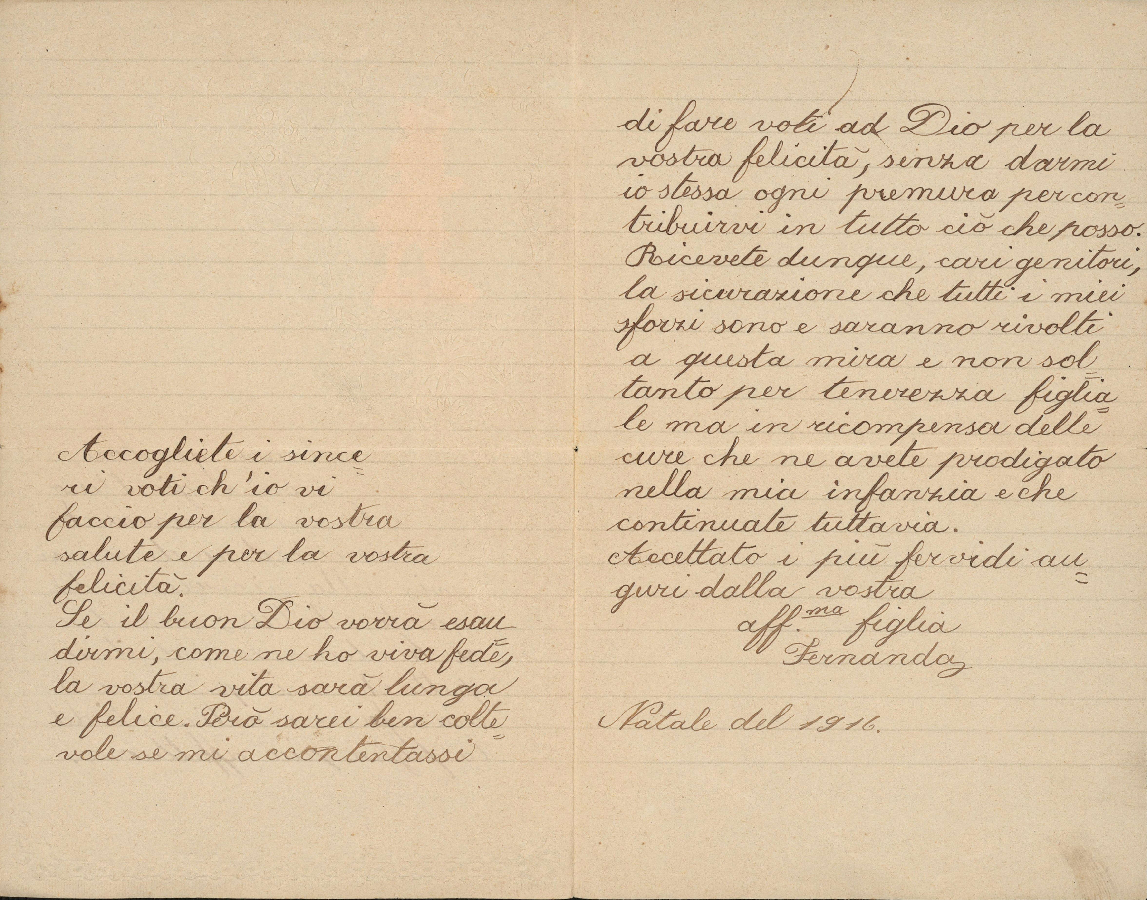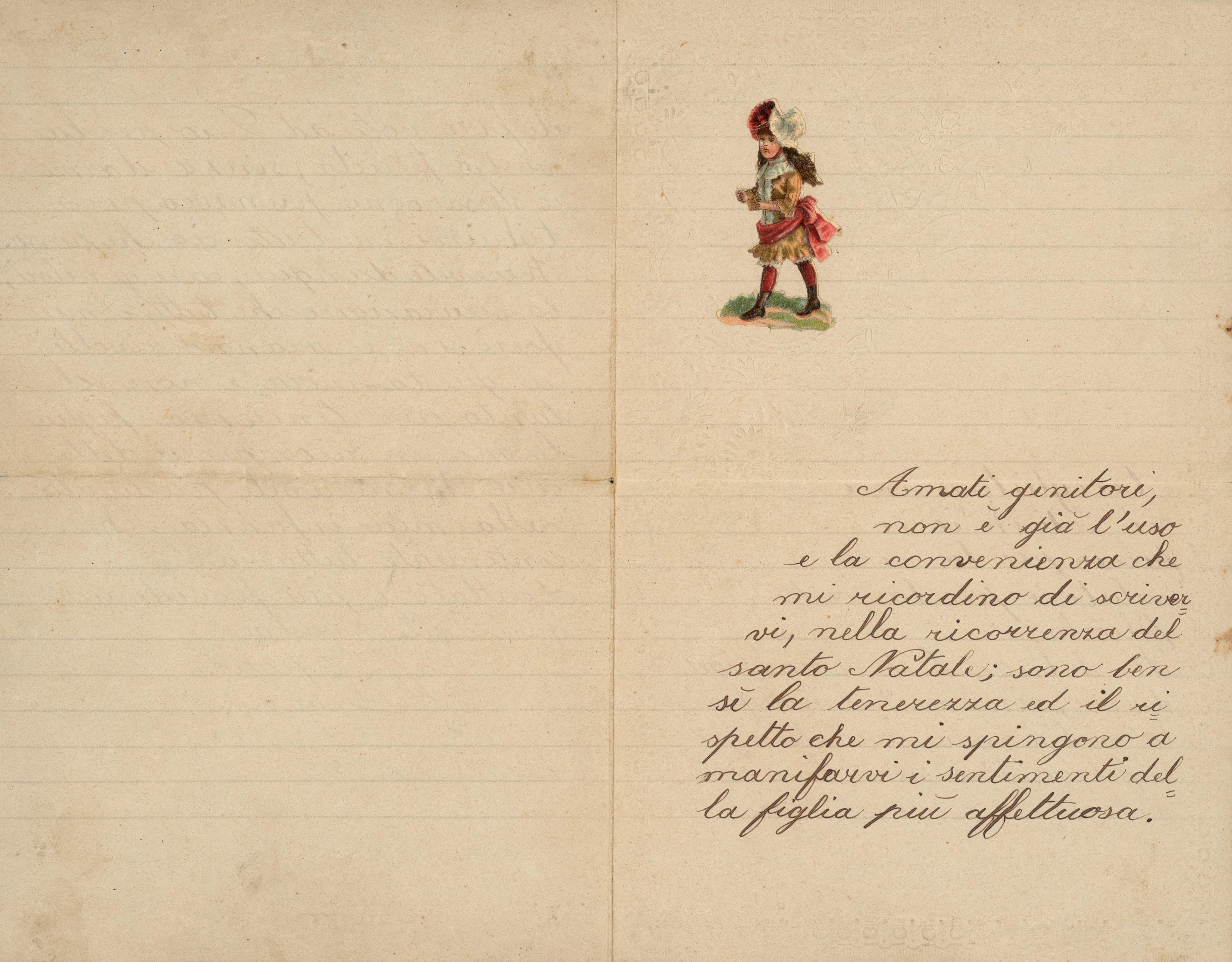 Amati genitori, non è già l’uso e la convenienza che mi ricordino di scrivervi, nella ricorrenza del santo Natale; sono bensì la tenerezza ed il rispetto che mi spingono a manifestarvi i sentimenti della figlia più affettuosa.