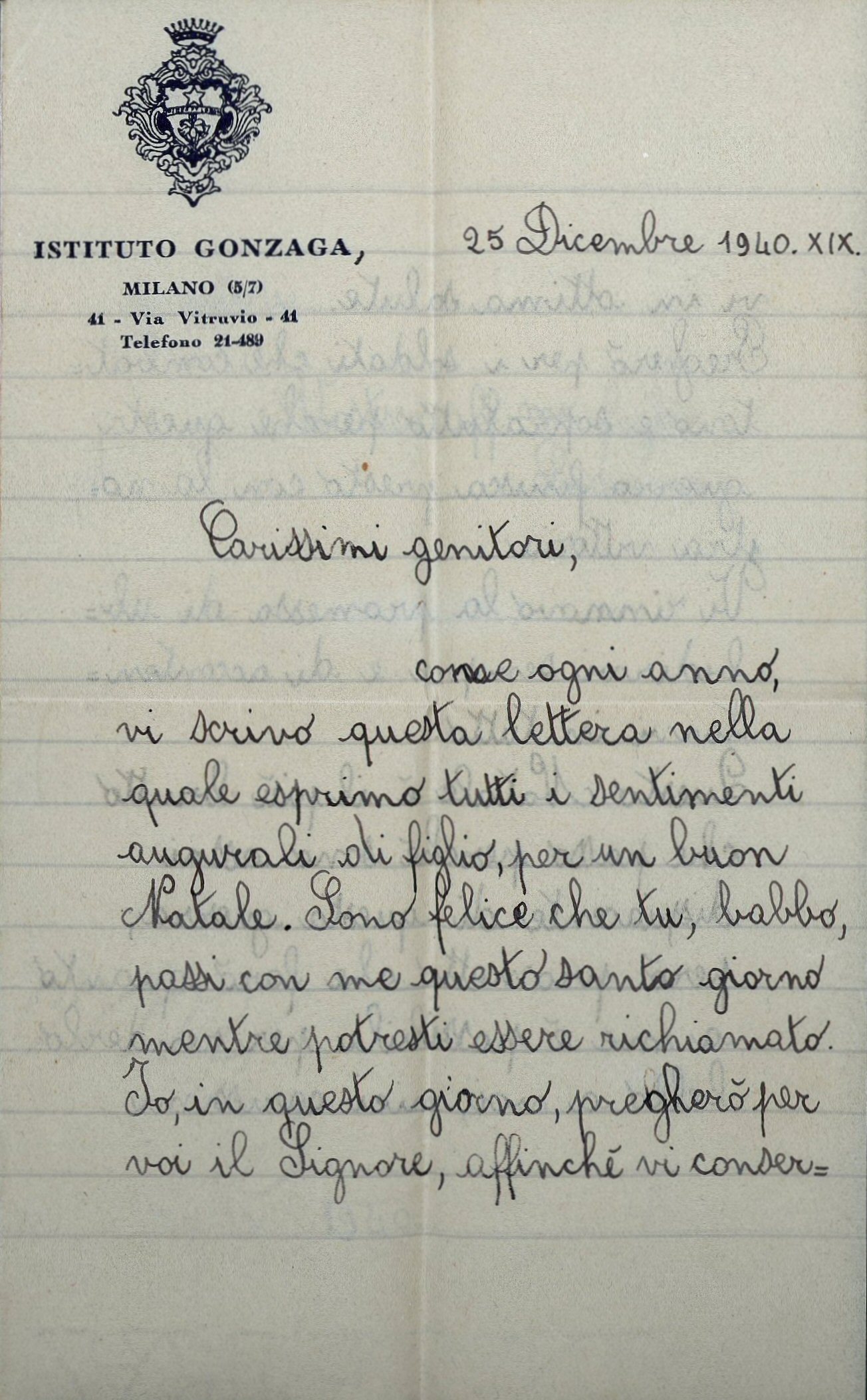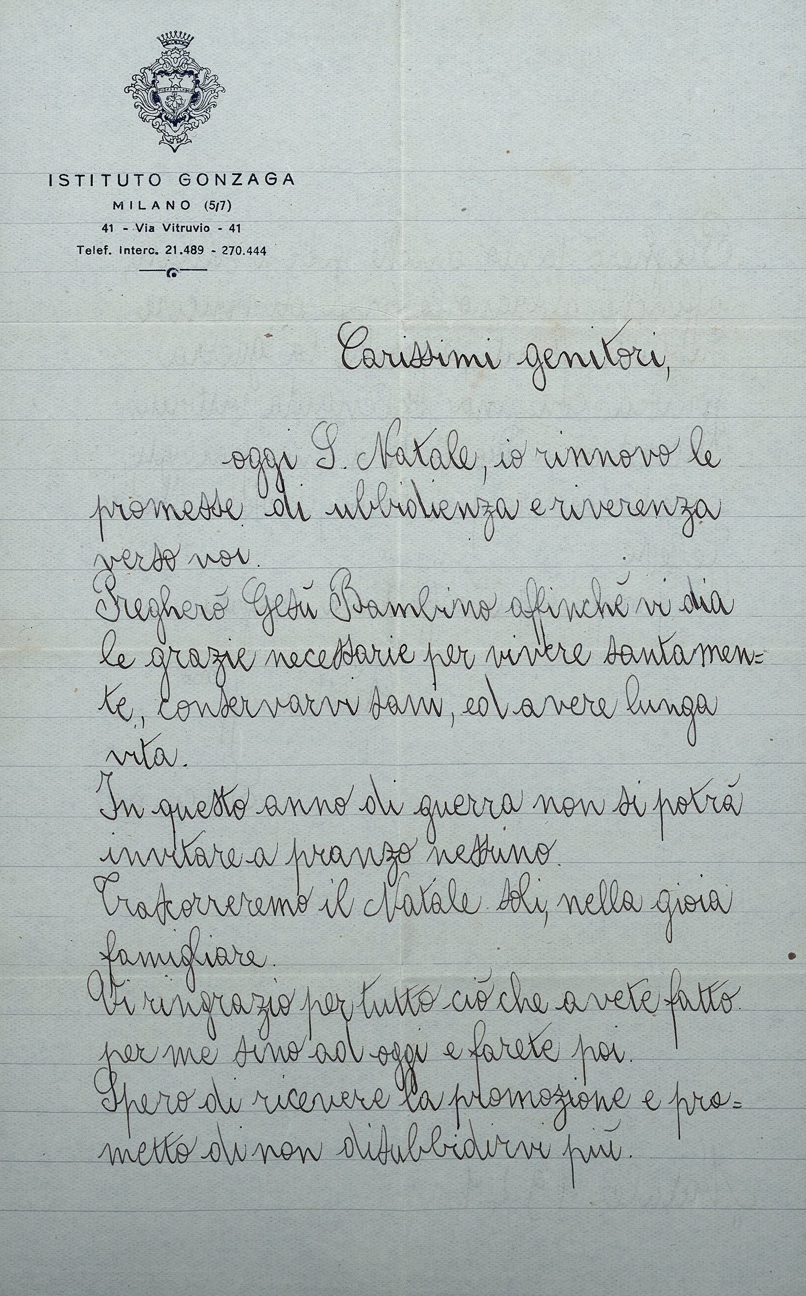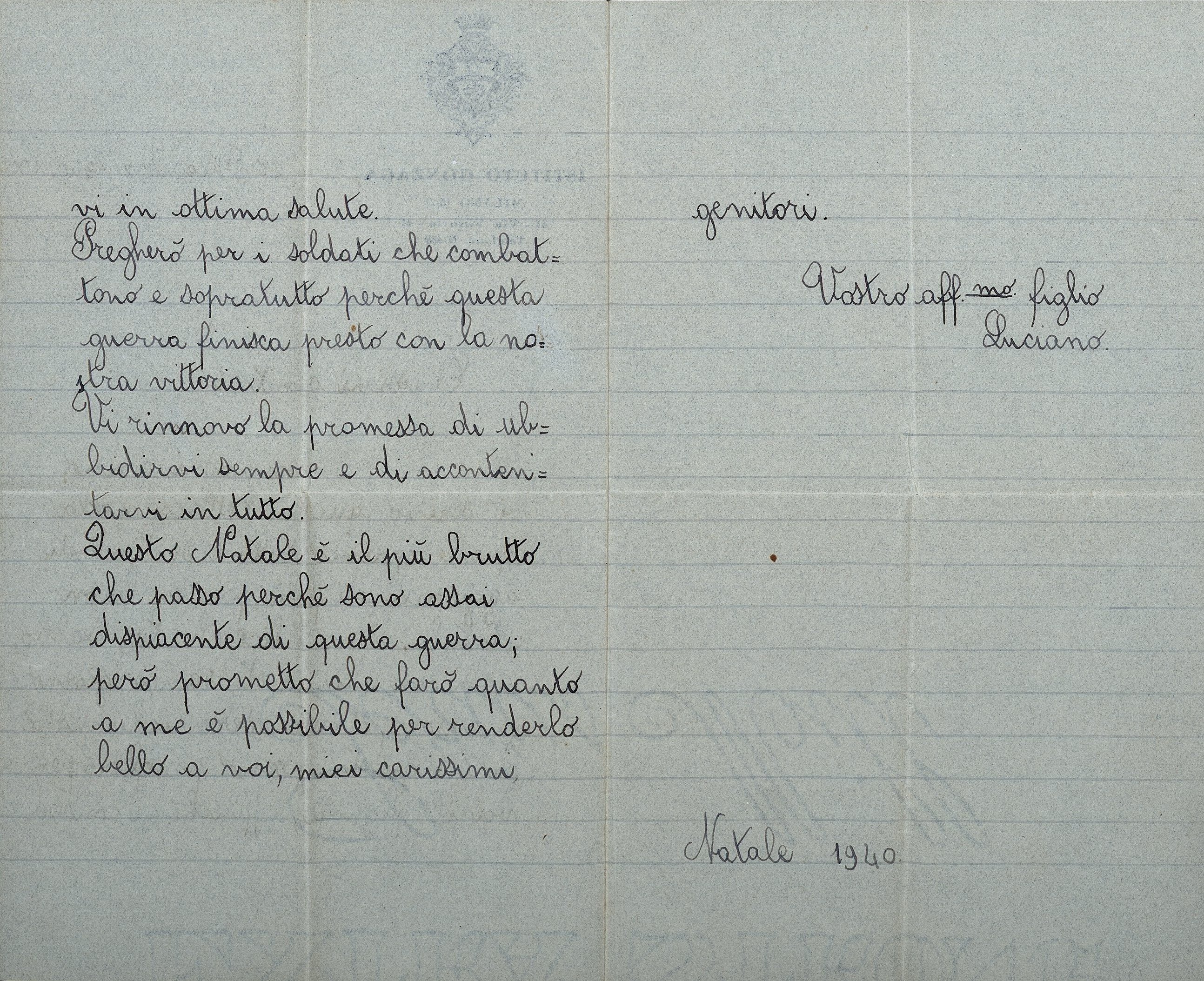 Questo Natale è il più brutto che passo perché sono assai dispiacente di questa guerra; però prometto che farò quanto a me è possibile per renderlo bello a voi, miei carissimi genitori.