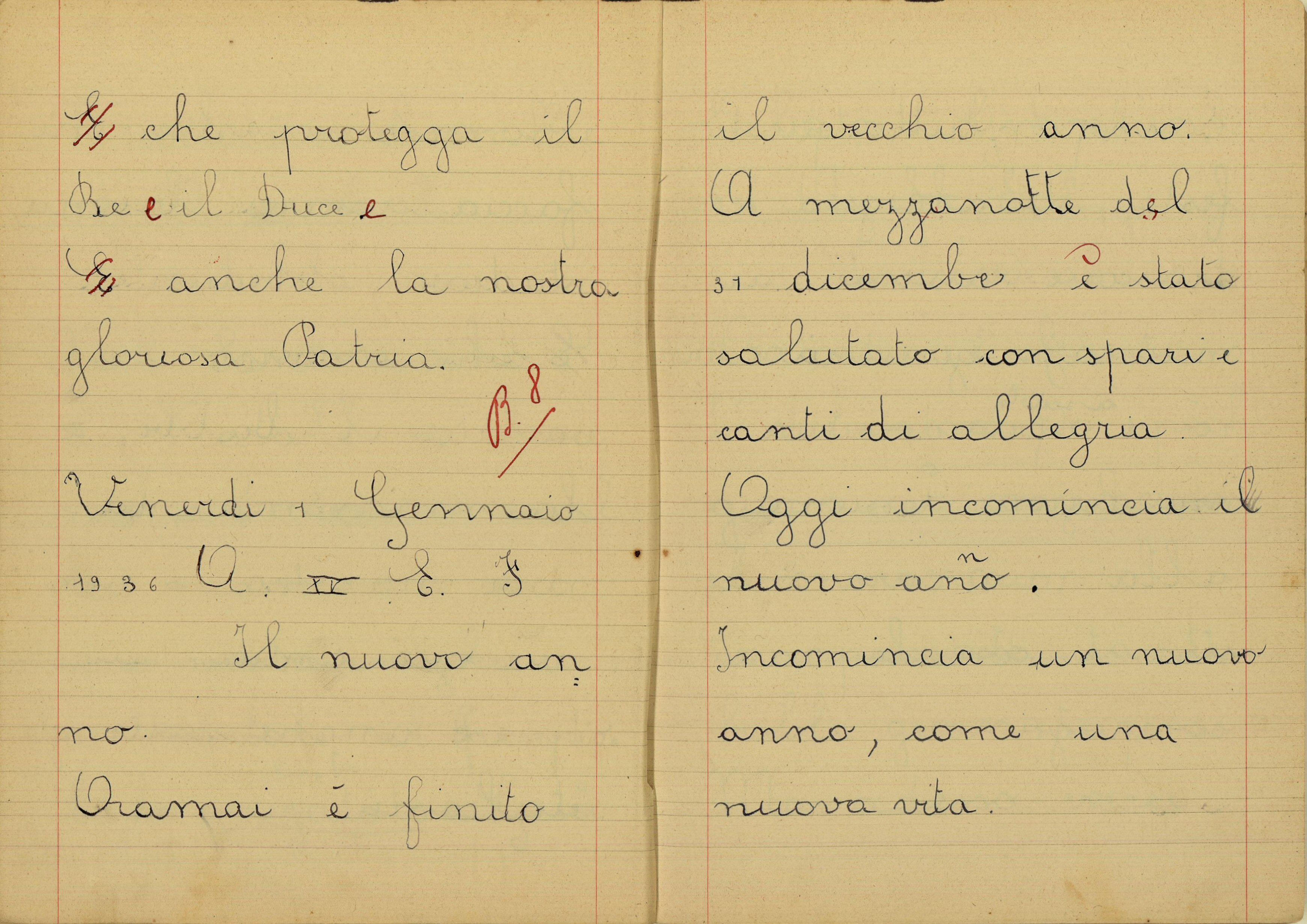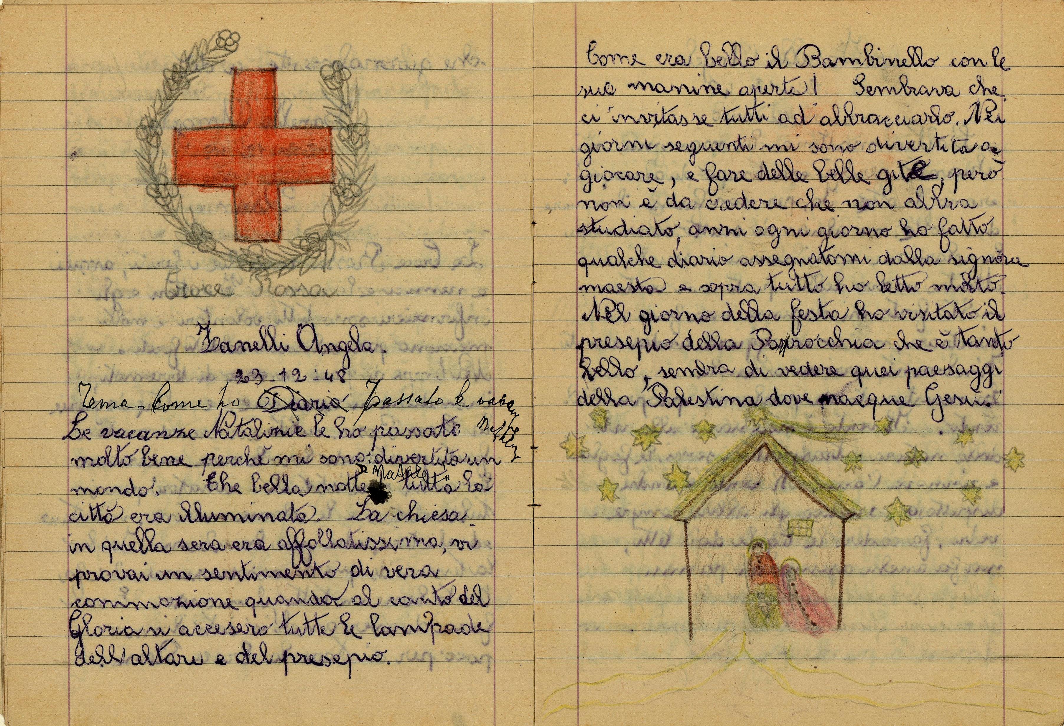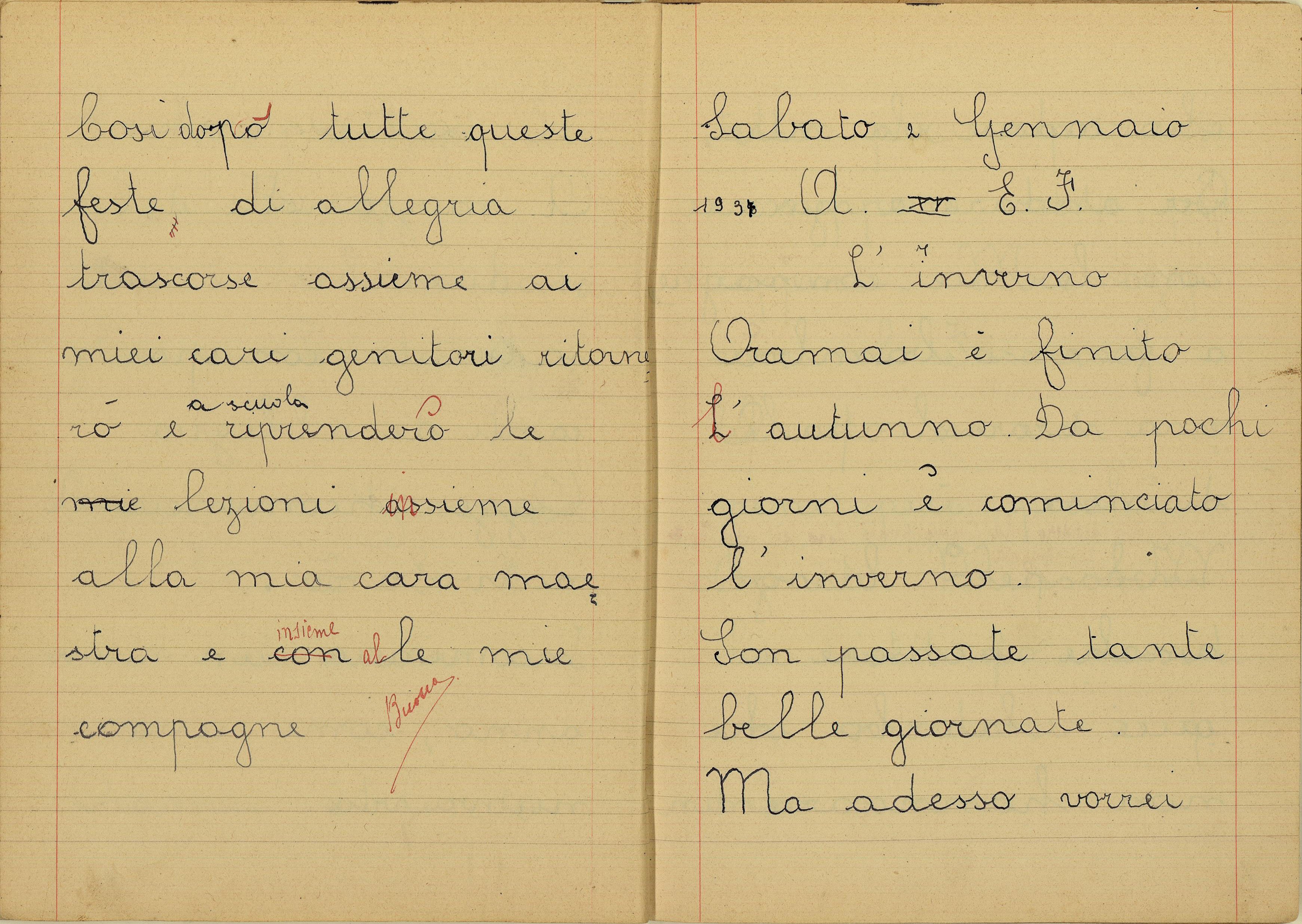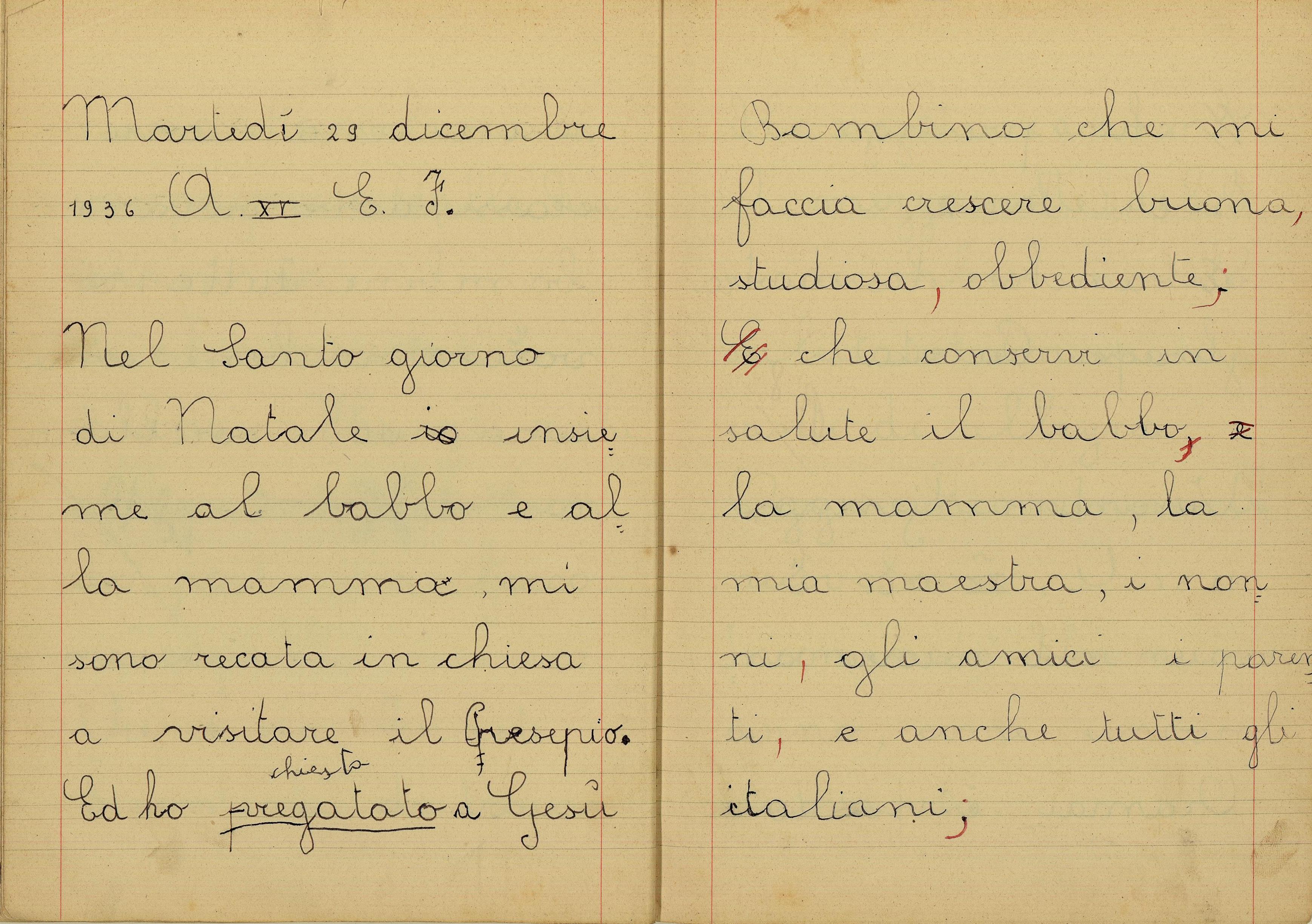 Nel Santo giorno di Natale io insieme al babbo e alla mamma, mi sono recata in chiesa a visitare il Presepio. Ed ho chiesto a Gesù Bambino che mi faccia crescere buona, studiosa, obbediente. E che conservi in salute il babbo, e la mamma, la mia maestra, i nonni, gli amici e parenti, e anche tutti gli italiani. E che protegga il Re e il Duce e anche la nostra gloriosa Patria.