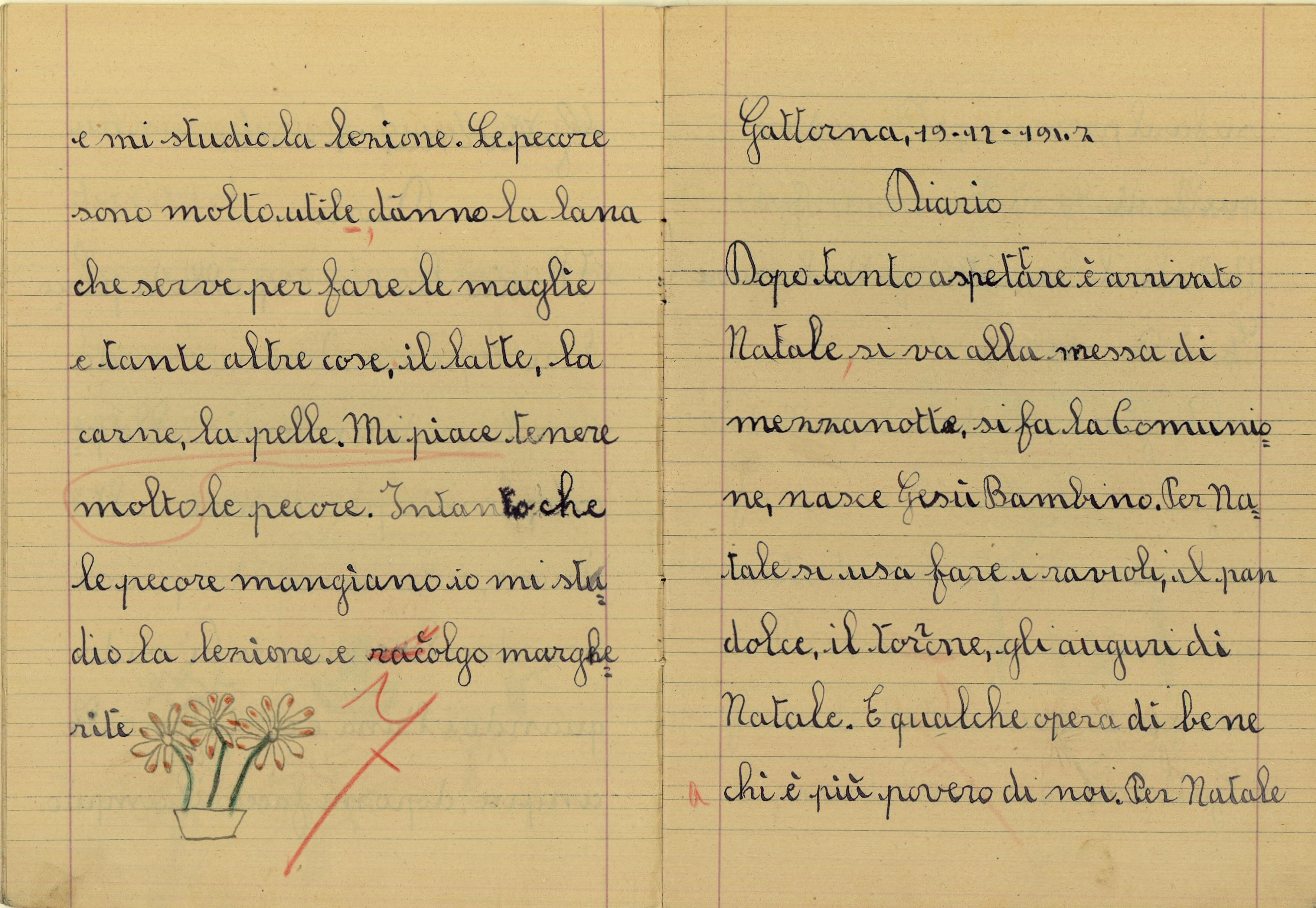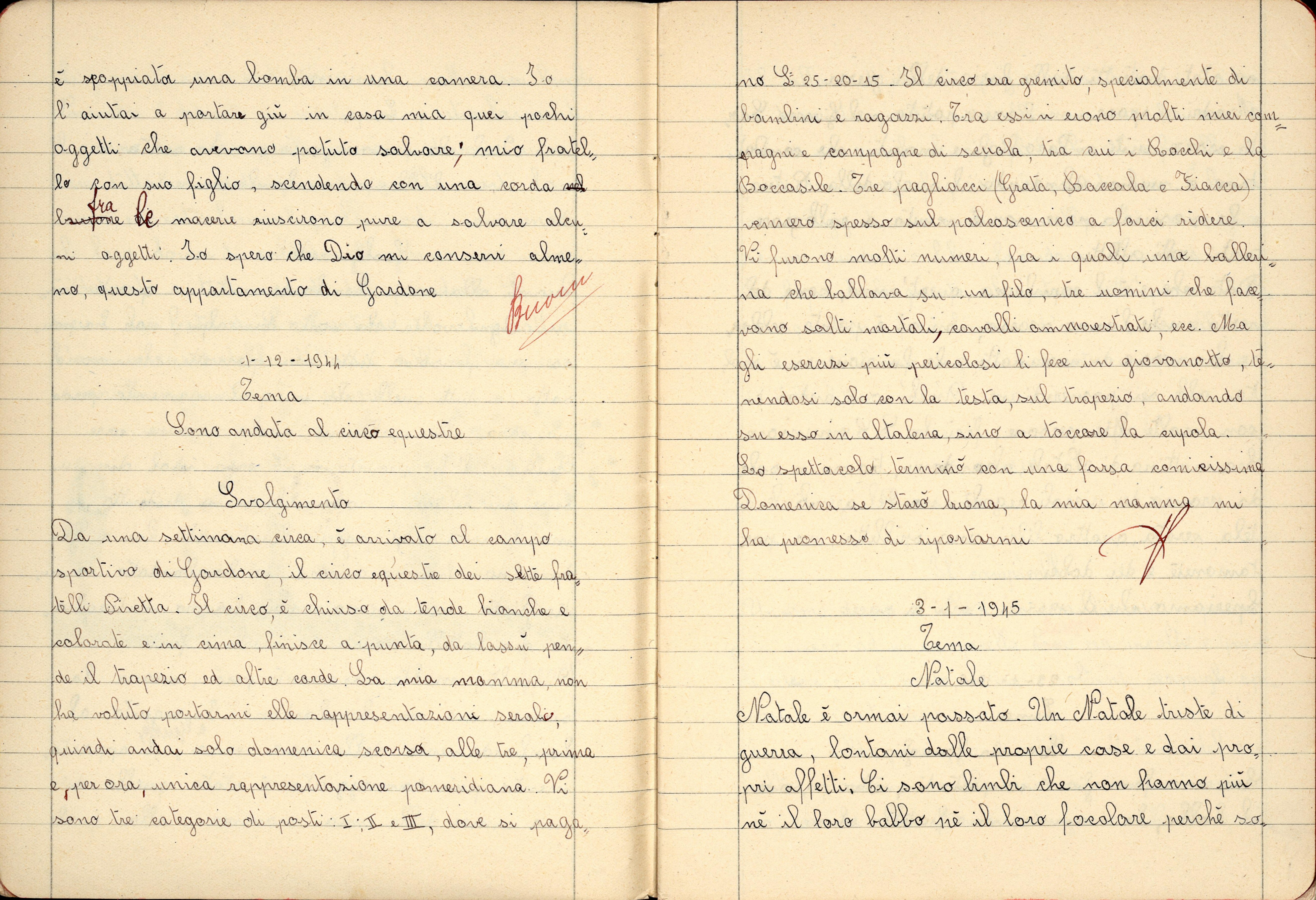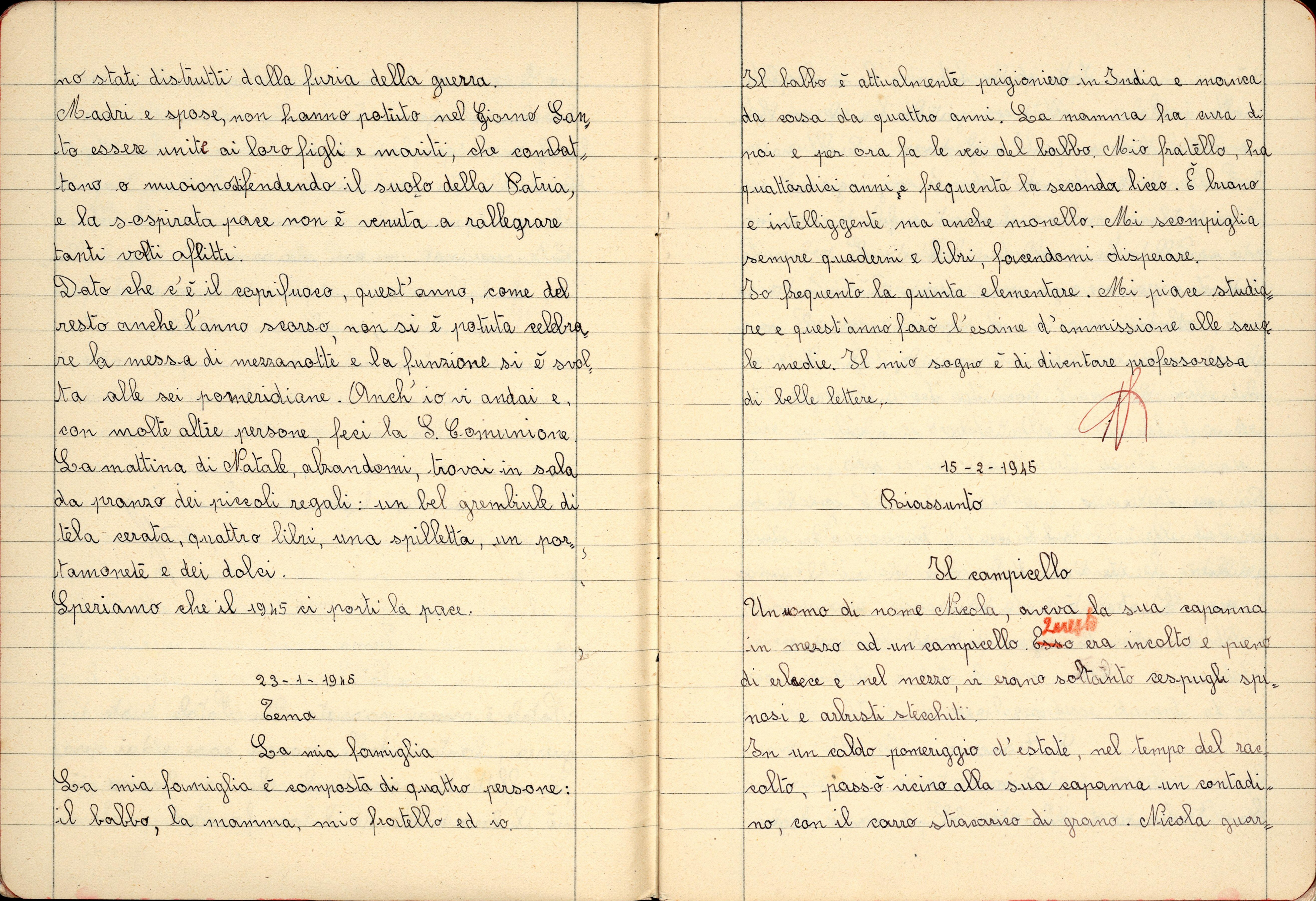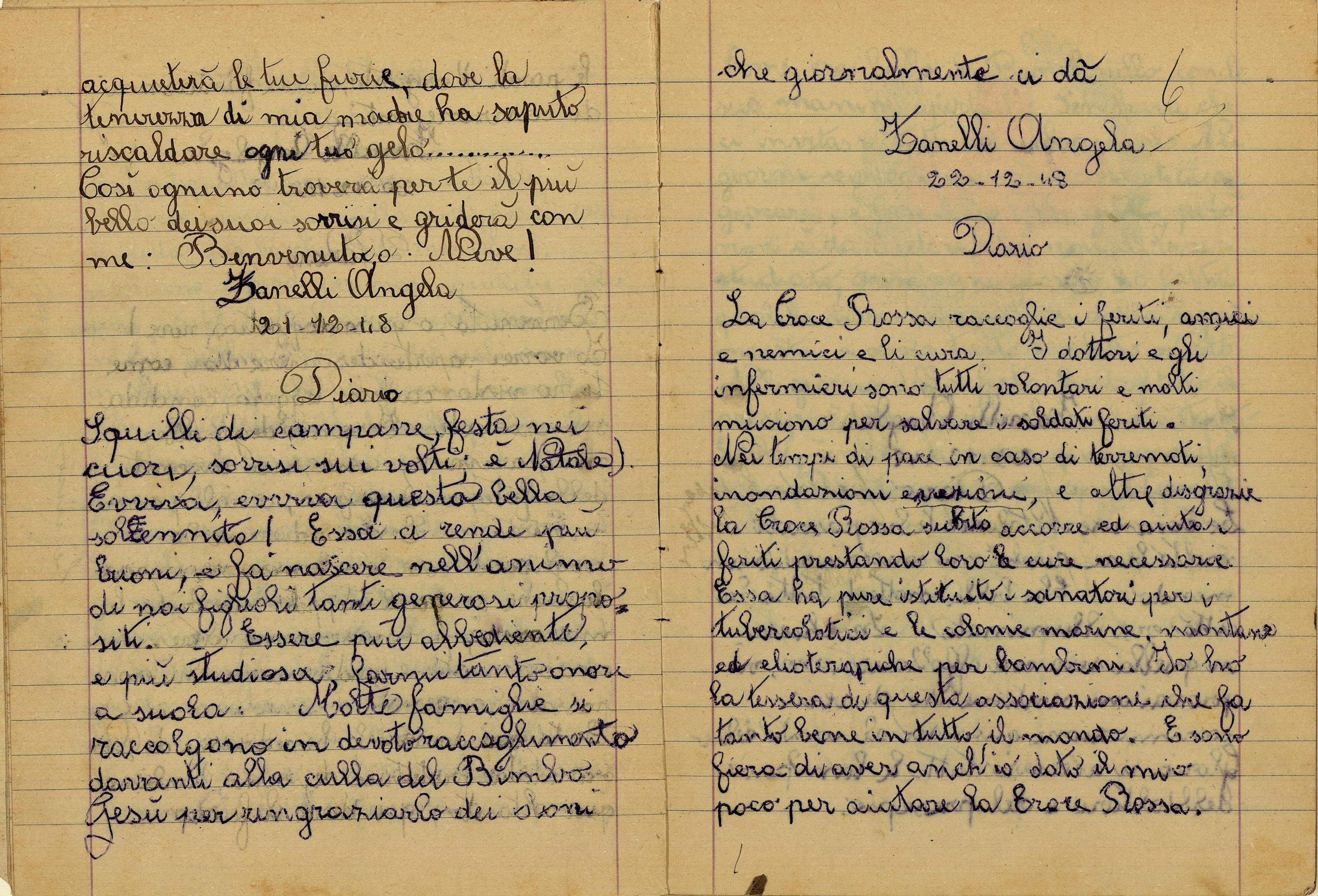 Nel Santo giorno di Natale io insieme al babbo e alla mamma, mi sono recata in chiesa a visitare il Presepio. Ed ho chiesto a Gesù Bambino che mi faccia crescere buona, studiosa, obbediente. E che conservi in salute il babbo, e la mamma, la mia maestra, i nonni, gli amici e parenti, e anche tutti gli italiani. E che protegga il Re e il Duce e anche la nostra gloriosa Patria.