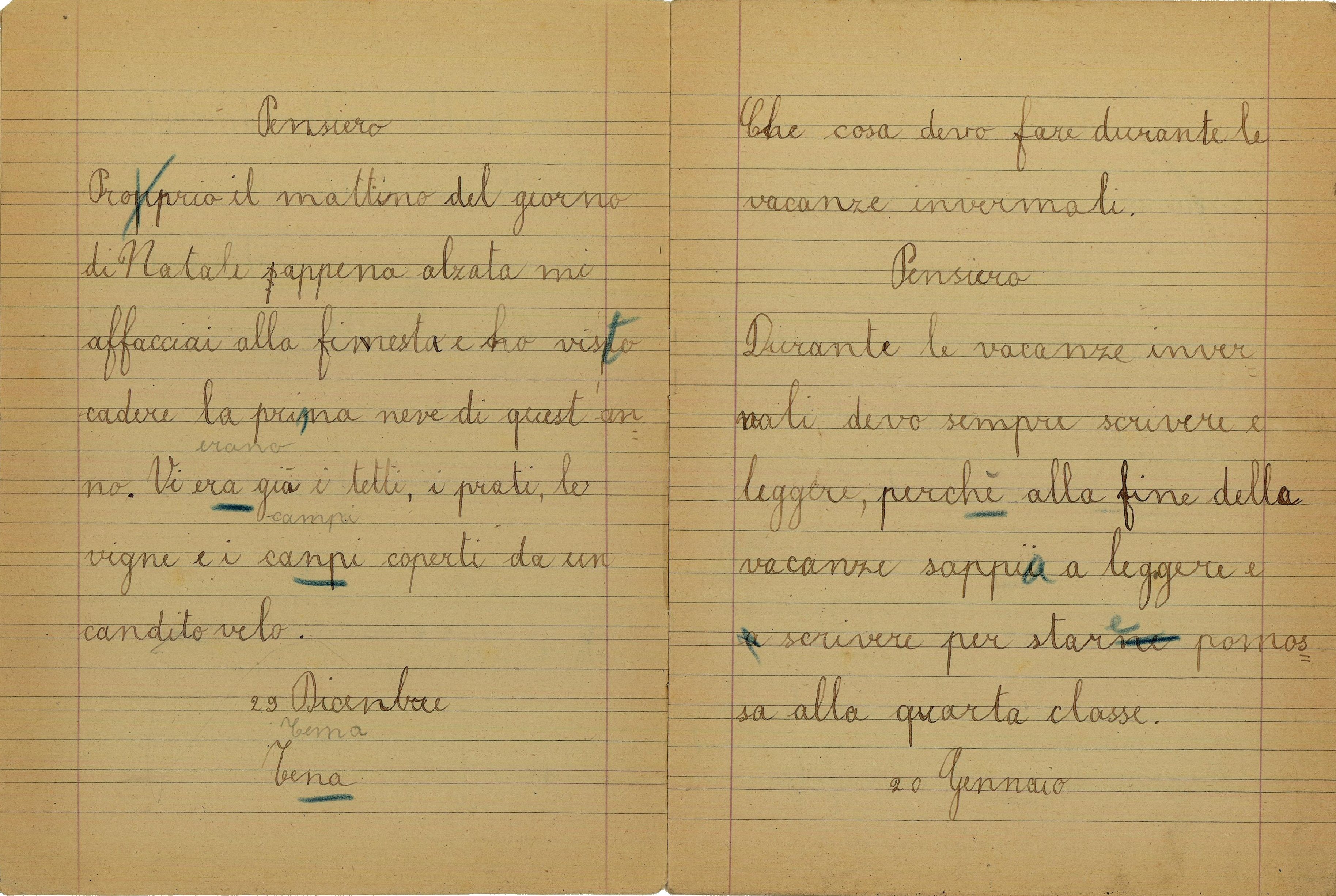 Durante le vacanze invernali devo sempre scrivere e leggere, perché alla fine delle vacanze sappii a leggere e a scrivere per starne pomossa alla quarta classe.