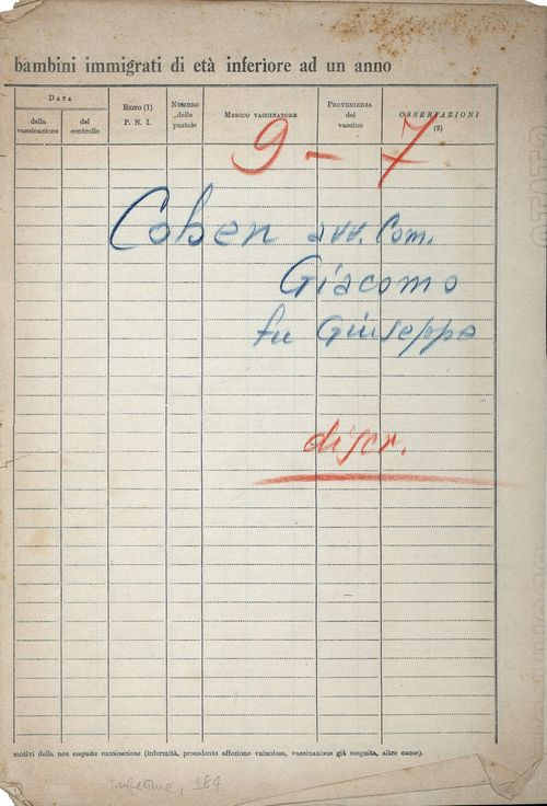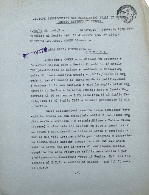 L’avvocato Cohen comm. Giacomo fu Giuseppe e fu Moreno Giulia, nato a Sestri Ponente il 18 aprile 1875, domiciliato in Milano e residente a Rapallo, risulta di buona condotta morale e civile, immune da precedenti penali nonché di buona condotta politica. Così i componenti la sua famiglia e cioè la moglie Arton Margherita fu Enrico e fu Loria Erminia, nata a Casale Monferrato il 20 settembre 1885, casalinga, ed il figlio Renato, nato il 31 luglio 1911 a Melnate, professore di pianoforte.