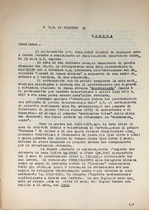 il sottoscritto Avv. Comm. Cohen Giacomo fu Giuseppe nato a Sestri Ponente e domiciliato in Rapallo, corso Cristoforo Colombo 32 alla E. V. espone: