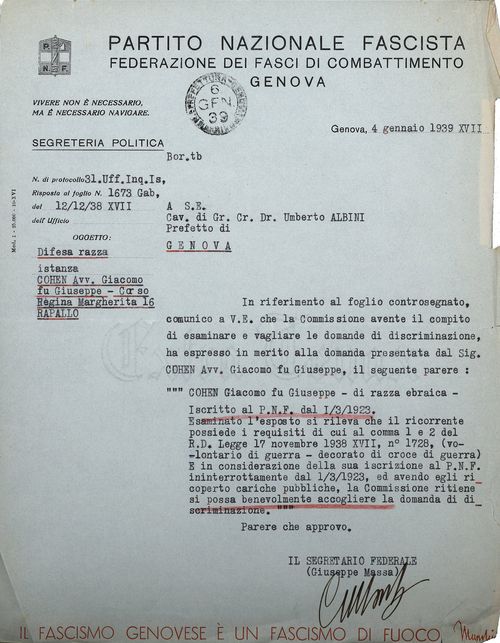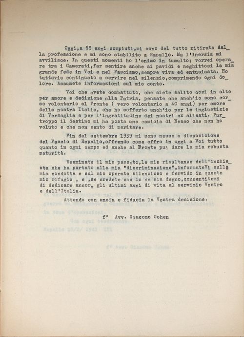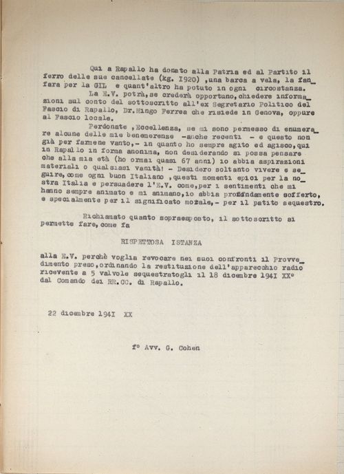 L’aver ottenuto, tra i primissimi, il provvedimento di discriminazione per se stesso e per l’intera famiglia è per Cohen un motivo di orgoglio; la sua incrollabile fede nel partito fascista lo spinge, il 25 gennaio 1941, a indirizzare una lettera a Mussolini offrendosi di «dedicare ancora gli ultimi anni di vita al servizio vostro e dell’Italia». Nemmeno il sequestro del suo apparecchio radio da parte dei Carabinieri, il 18 dicembre 1941, «perché di razza ebraica», vale a convincerlo della gravità della situazione; la sofferenza che ha provato «specialmente per il significato morale, per il patito sequestro» lo induce a rivolgere al Prefetto una istanza di revoca, accompagnata da copia del suo curriculum vitae. Fino all’ultimo, Giacomo Cohen mantiene l’illusione che i suoi meriti passati valgano a garantire, per lui e per la sua famiglia, la continuazione di una vita normale.