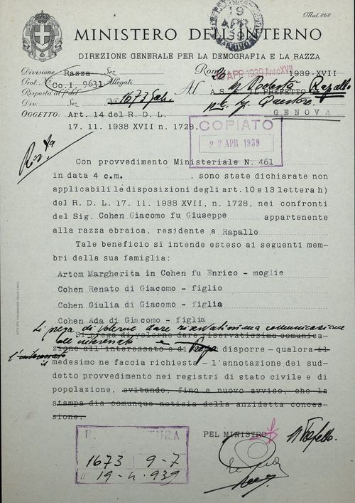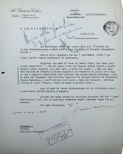 Oggetto: Difesa razza istanza COHEN Avv. Giacomo fu Giuseppe – Corso regina Margherita 16 Rapallo