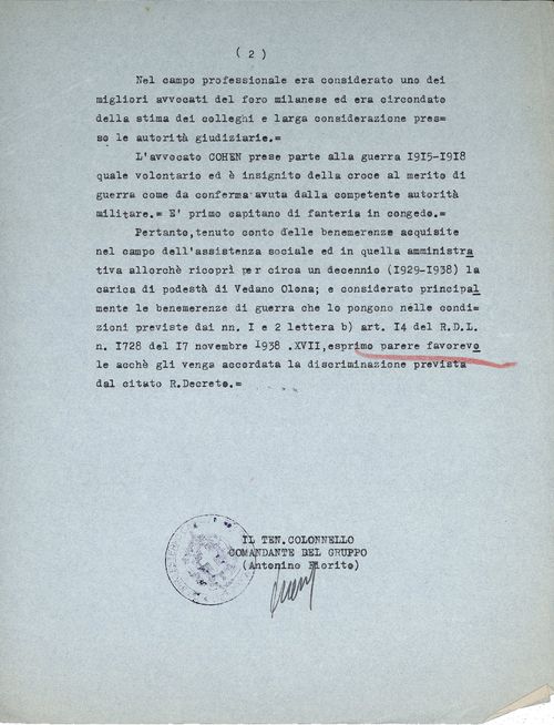L’avvocato COHEN prese parte alla guerra 1915 – 1918 quale volontario ed è insignito della croce al merito di guerra come da conferma avuta dalla competente autorità militare. E’ primo capitano di fanteria in congedo.
