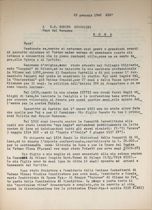 Perdonate se, mentre si maturano così gravi e grandiosi eventi mi permetto chiedere al Vostro animo sereno di esaminare questa mia istanza e consentire che io possa rendermi utile, come me ne sento degno, alla Patria e al Partito.
