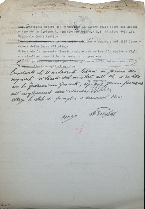 Il sottoscritto non ha potuto esaminare la nota ministeriale suindicata e confida che il provvedimento non riguardi i cittadini italiani di razza ebraica “discriminati” (quale è il sottoscritto per Decreto Ministeriale 4 aprile 1939 XVIII n. 461) e che esso possa essere senz’altro revocato.
