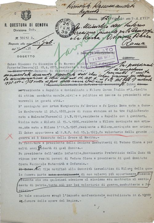 Oggetto: Cohen Giacomo fu Giuseppe e fu Moreno Giulia nato a Sestri Ponente (Genova) il 18.4.1875, residente a Rapallo. Domanda di discriminazione.