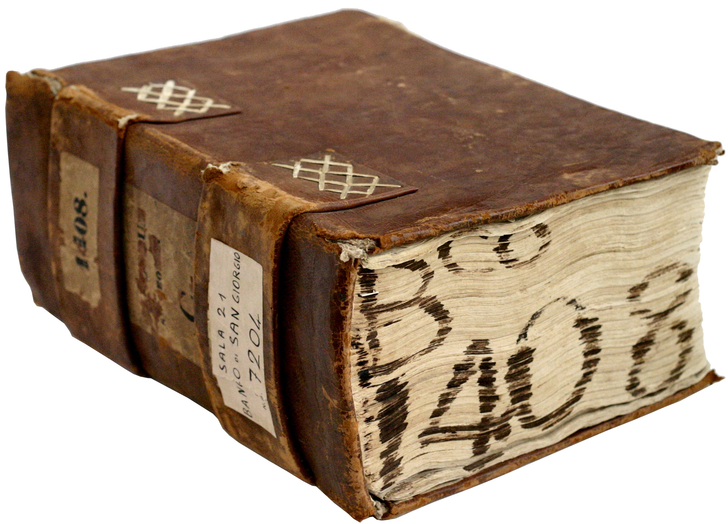 Il mastro del 1408, anno del primo esercizio del banco di San Giorgio, è costituito fondamentalmente dai conti correnti dei clienti, in cui si segnavano in dare i prelievi e i giri conto ad altri e in avere i versamenti e i bonifici da terzi, e da un lunghissimo conto cassa ove si annotavano rispettivamente le entrate in dare e le uscite in avere. Il registro, come tutti quelli che gli succederanno sino alla soppressione del banco di San Giorgio, era tenuto rigorosamente in partita doppia. I conti dei clienti erano disposti sulle due metà verticali della medesima pagina, con il dare a sinistra e l’avere a destra. Il titolare del conto era nominato in testa al dare con la data della prima operazione e sulla medesima pagina potevano anche iscriversi due o tre conti; se a un certo punto lo spazio non bastava più, il conto veniva chiuso annotando nella sezione minore il saldo (in modo da pareggiare dare e avere) e iscrivendolo nella sezione opposta di un nuovo conto, intestato al medesimo titolare e aperto in una pagina nuova.