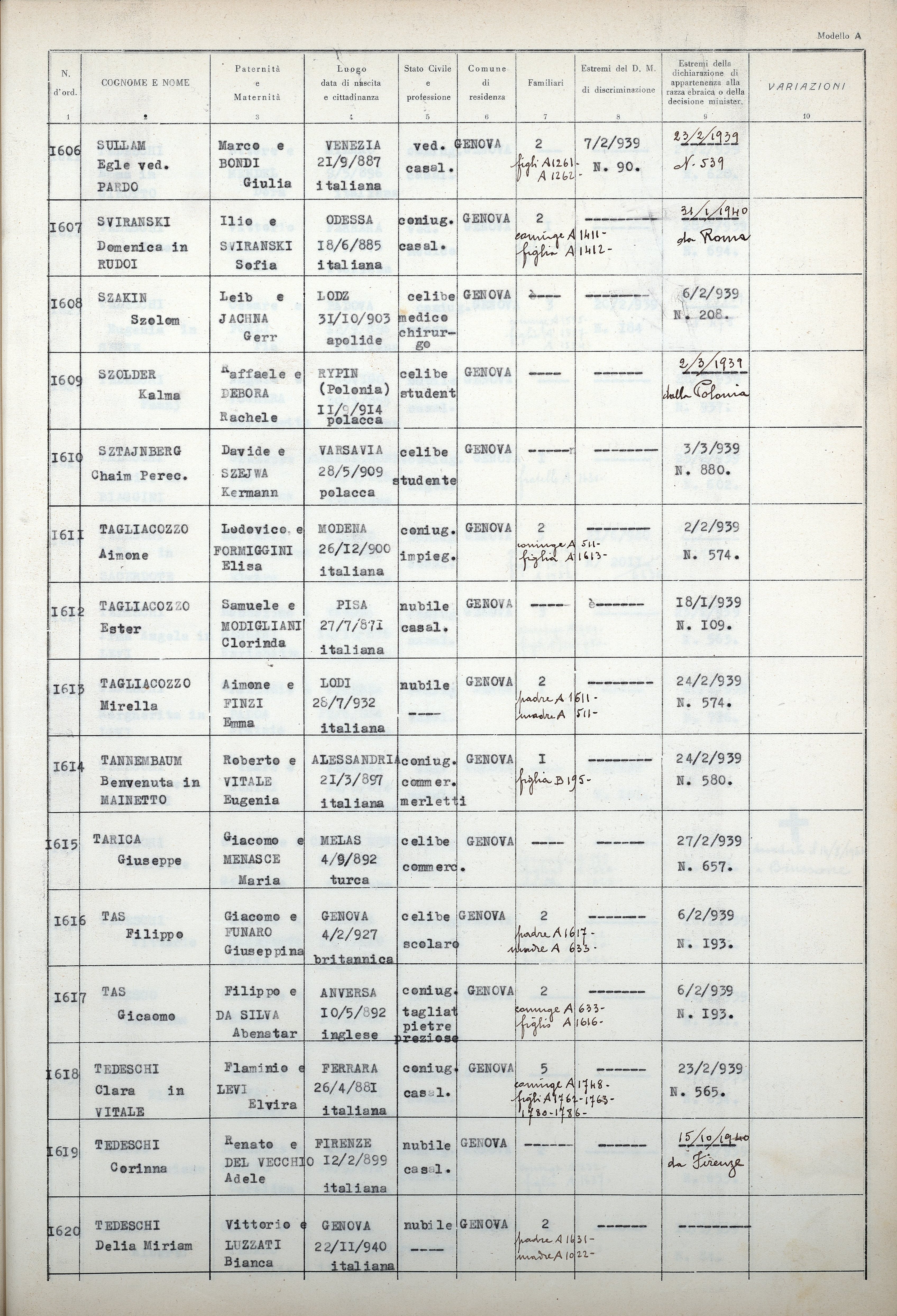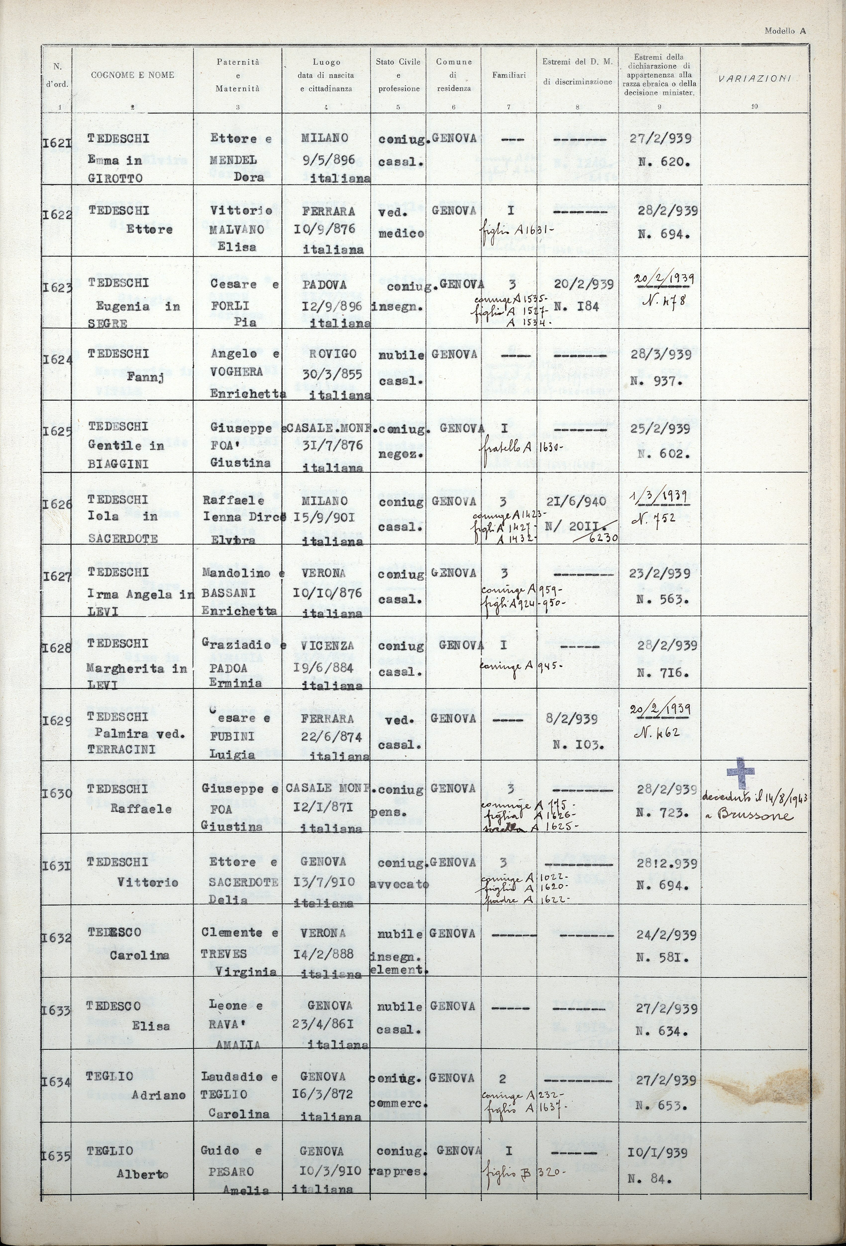 Quanto la signorina TEDESCO Carolina fu Clemente Carlo e di Treves Virginia, nata a Venezia il 14 febbraio 1888, residente a Genova, via E. Toti n. 9/26, fin dal 1908, di razza ebraica, insegnante elementare collocata a riposo in seguito ai provvedimenti razziali, ha esposto nell’allegata istanza corrisponde a verità, in base ai documenti citati nell’istanza stessa e controllati.