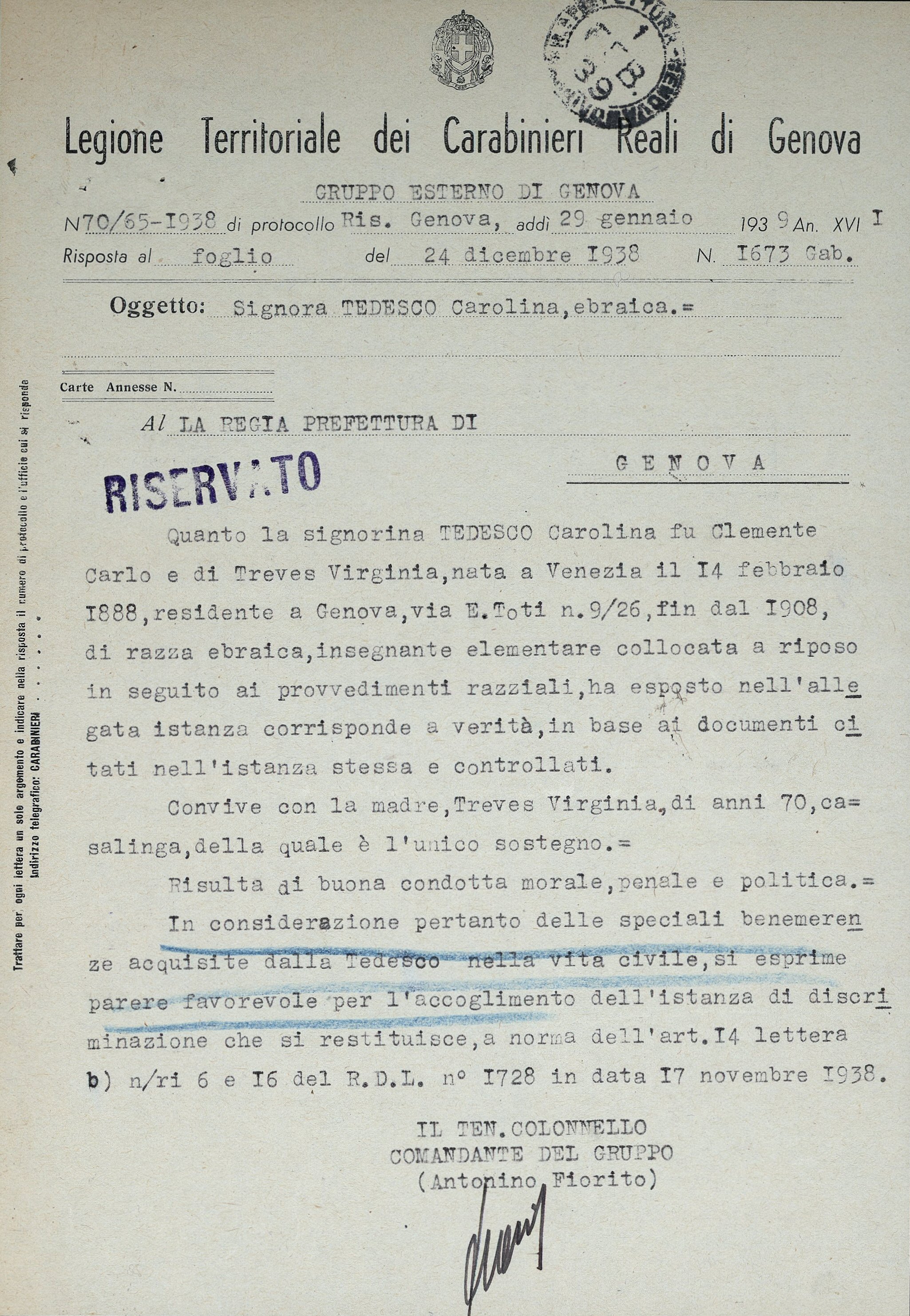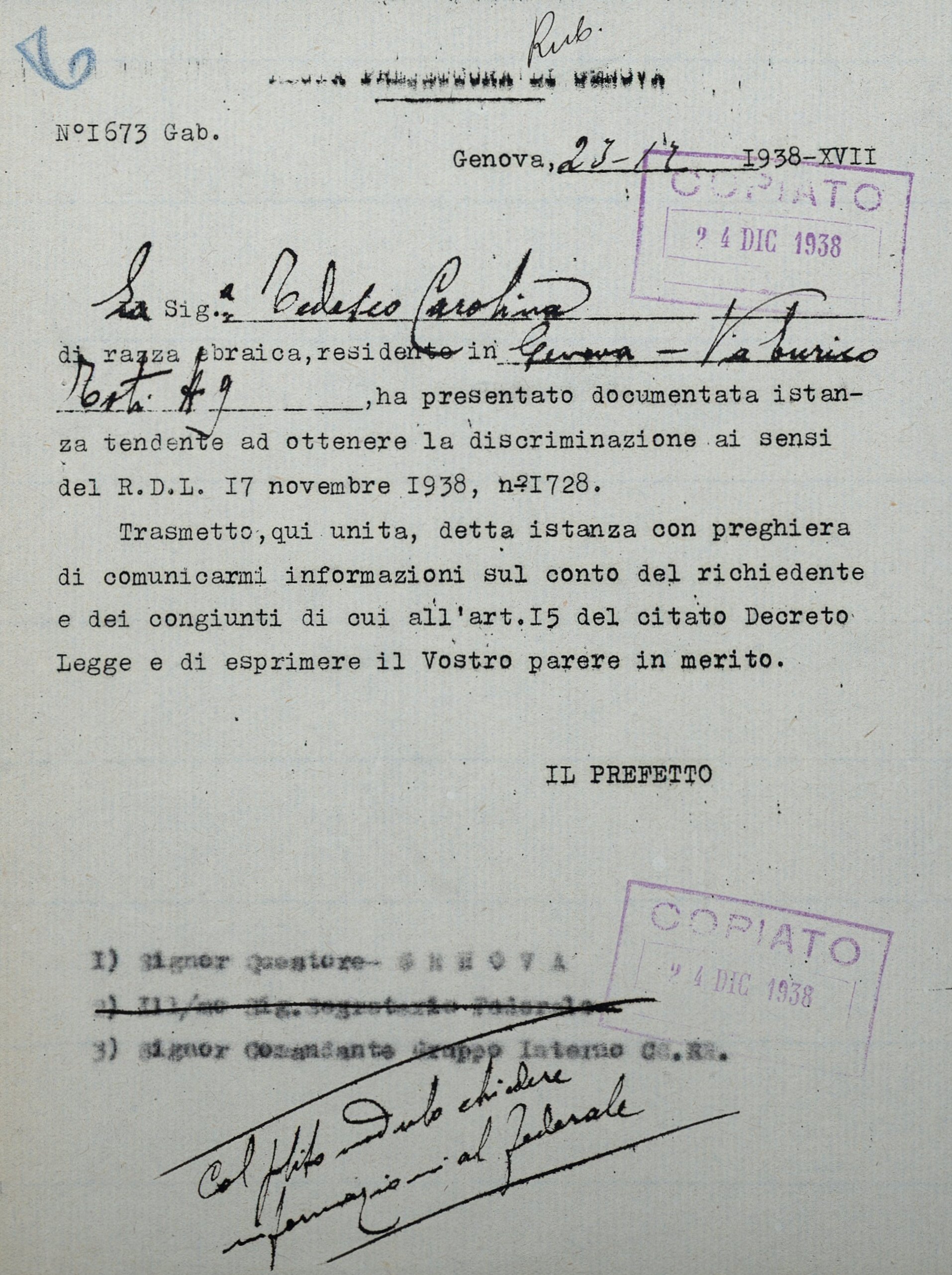La signora Tedesco Carolina di razza ebraica, residente in Genova – Via Enrico Toti n. 9, ha presentato documentata istanza tendente ad ottenere la discriminazione ai sensi del R.D.L. 17 novembre 1938, n. 1728.