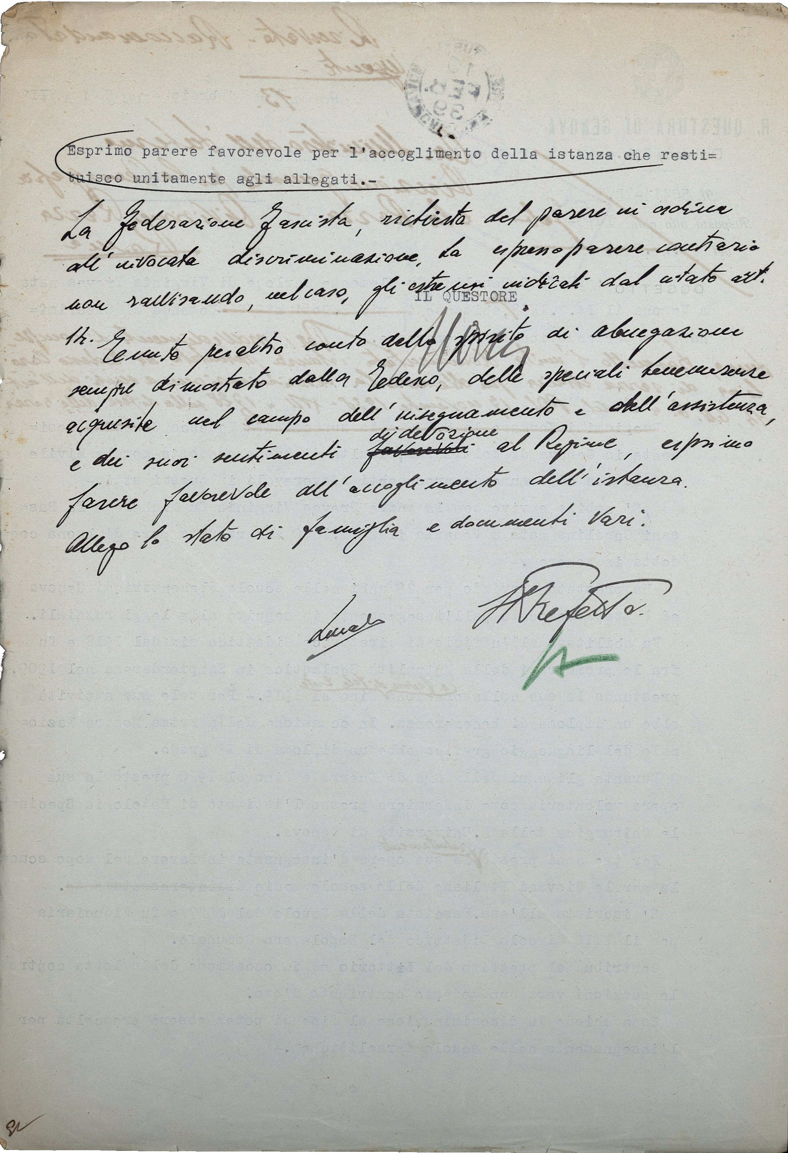 Minuta della lettera inviata dal Prefetto di Genova alla Direzione Generale per la Demografia e la Razza, ricavata dalla correzione di quella ricevuta dalla Questura l’8 febbraio 1939. Il parere espresso dal questore era: «Esprimo parere favorevole per l’accoglimento della istanza che restituisco unitamente agli allegati».
