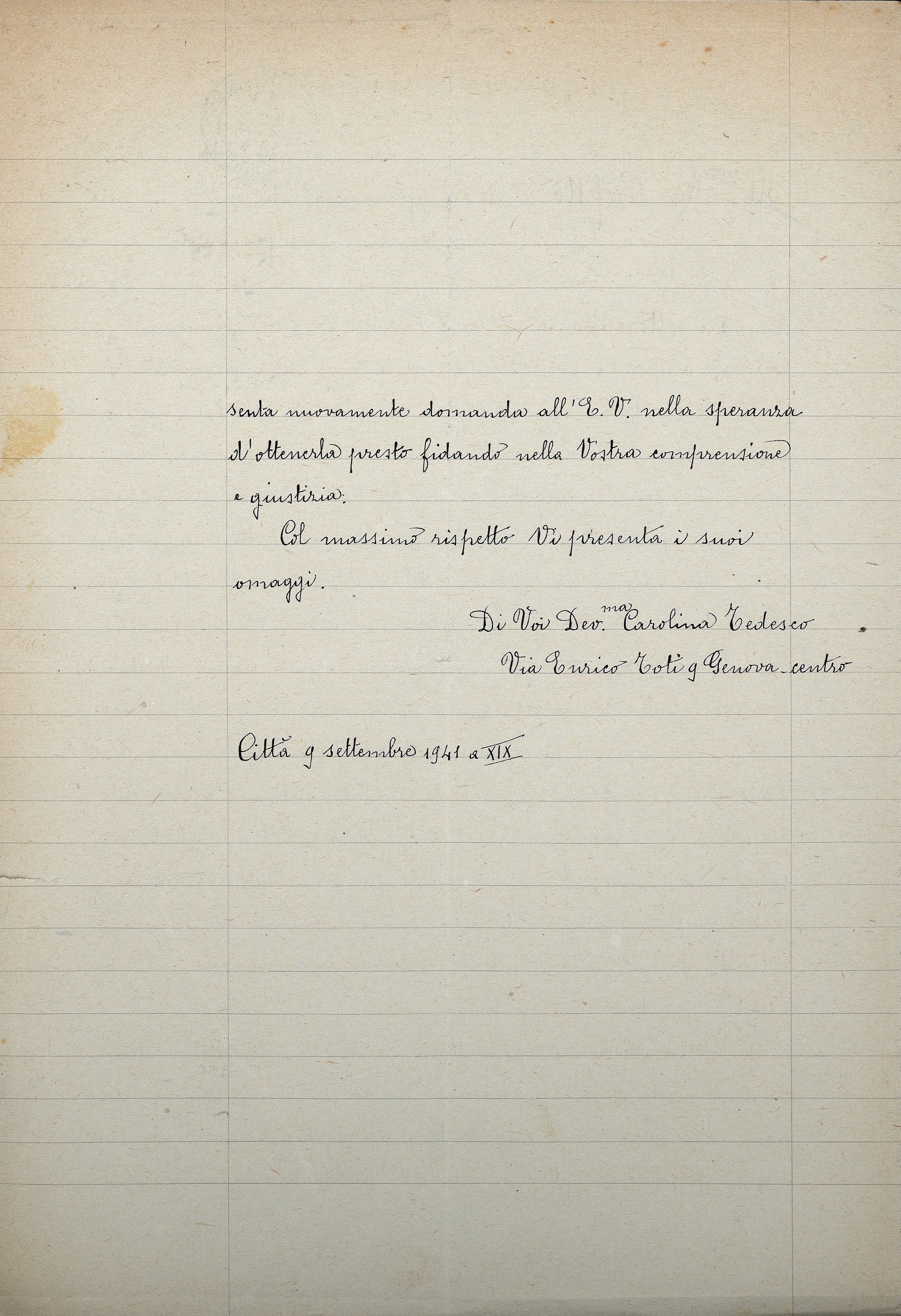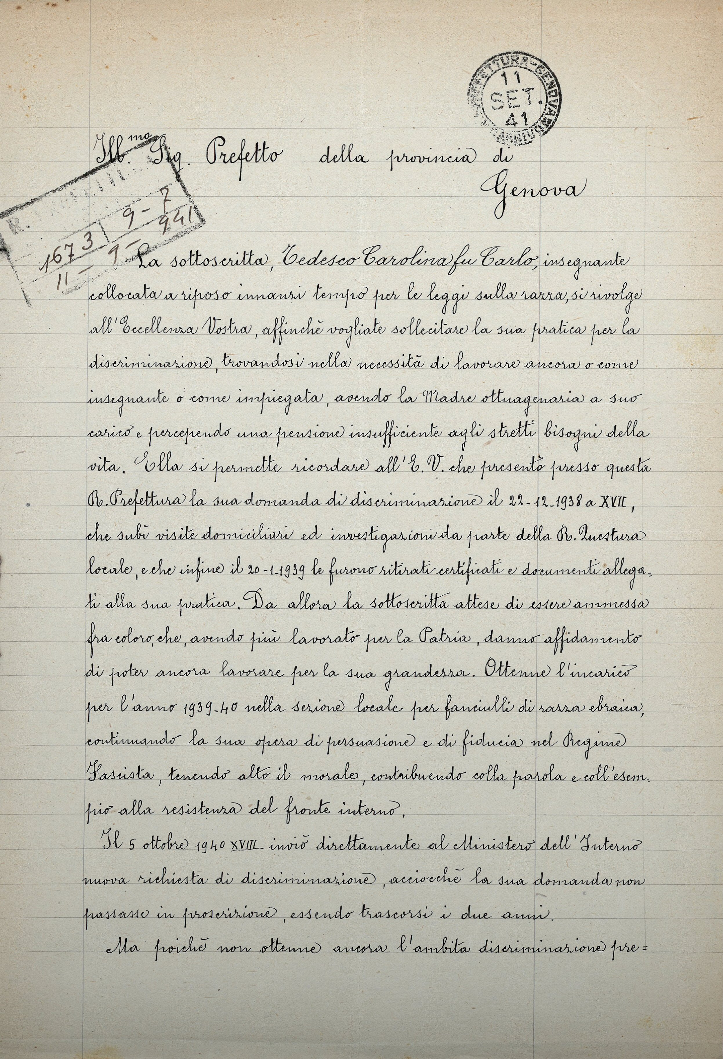 La sottoscritta, Tedesco Carolina fu Carlo, insegnante collocata a riposo innanzi tempo per le leggi sulla razza, si rivolge all’Eccellenza Vostra affinché vogliate sollecitare la sua pratica per la discriminazione, trovandosi nella necessità di lavorare ancora o come insegnante o come impiegata, avendo la Madre ottuagenaria a suo carico e percependo una pensione insufficiente agli stretti bisogni della vita. Ella si permette ricordare all’E.V. che presentò presso questa R. Prefettura la sua domanda di discriminazione il 22.12.1938 a XVII, che subì visite domiciliari ed investigazioni da parte della R. Questura locale, e che infine il 20.1.1939 le furono ritirati certificati e documenti allegati alla sua pratica. Da allora la sottoscritta attese di essere ammessa fra coloro, che, avendo più lavorato per la Patria, danno affidamento di poter ancora lavorare per la sua grandezza. Ottenne l’incarico per l’anno 1939-40 nella sezione locale per fanciulli di razza ebraica, continuando la sua opera di persuasione e di fiducia nel Regime Fascista, tenendo alto il morale, contribuendo colla parola e coll’esempio alla resistenza del fronte interno.