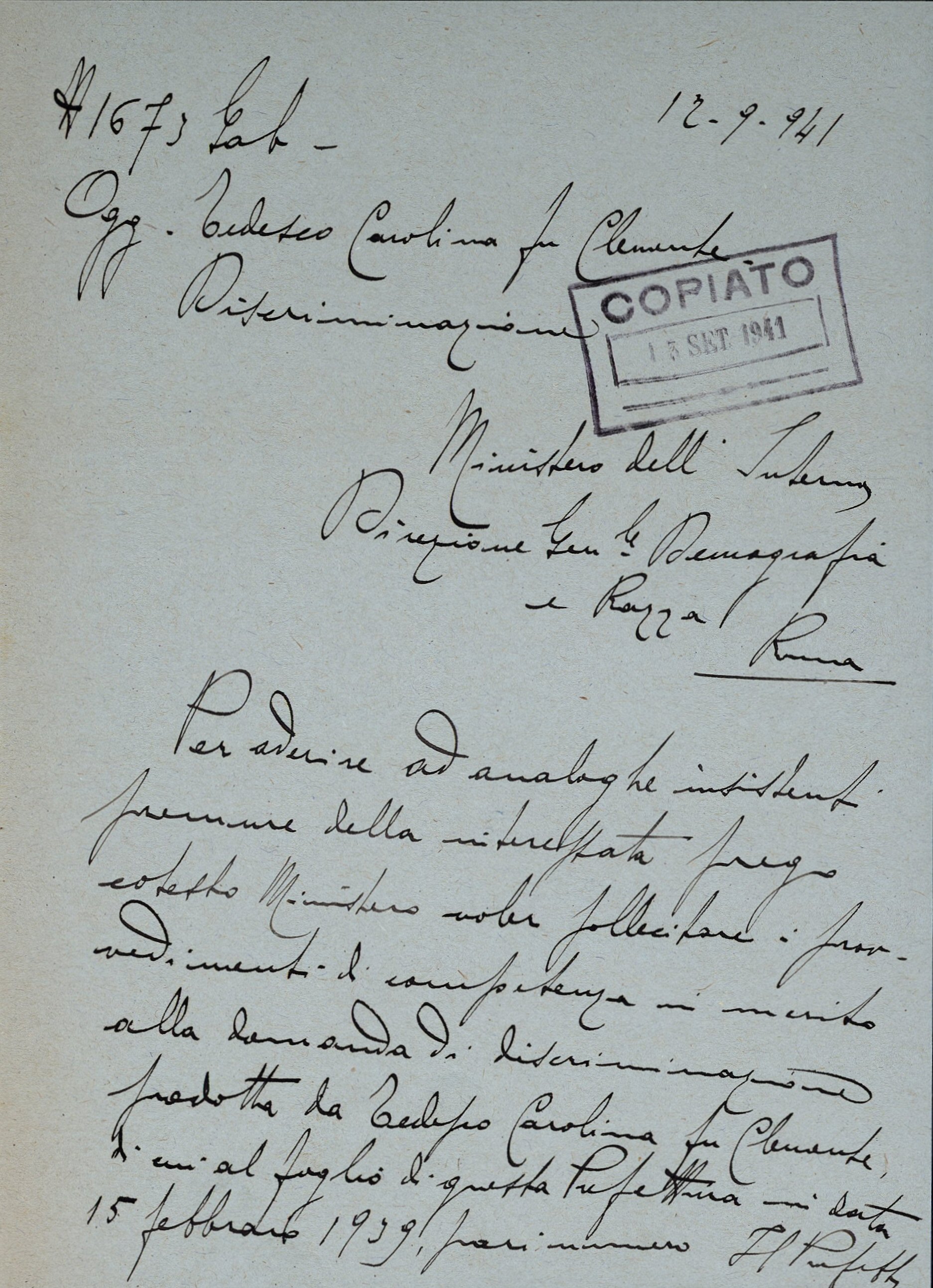 Il 19 settembre 1941 il Prefetto inoltra la richiesta al Ministero dell’Interno – Direzione Generale per la Demografia e la Razza, sollecitando che i provvedimenti di competenza vengano adottati in tempi rapidi.