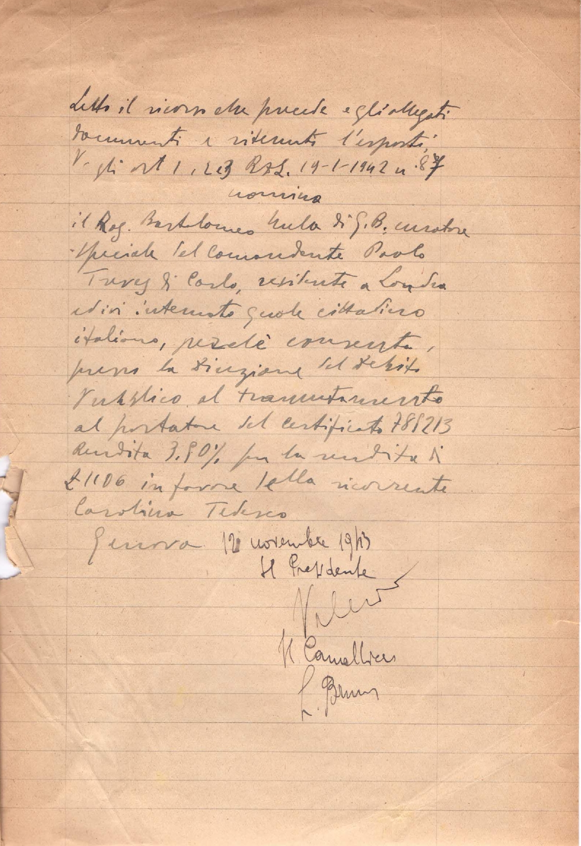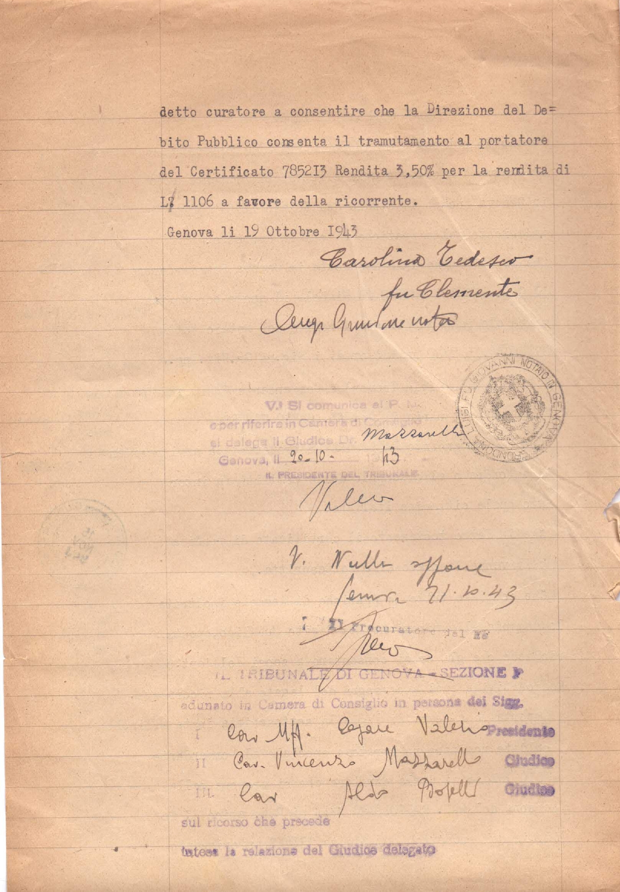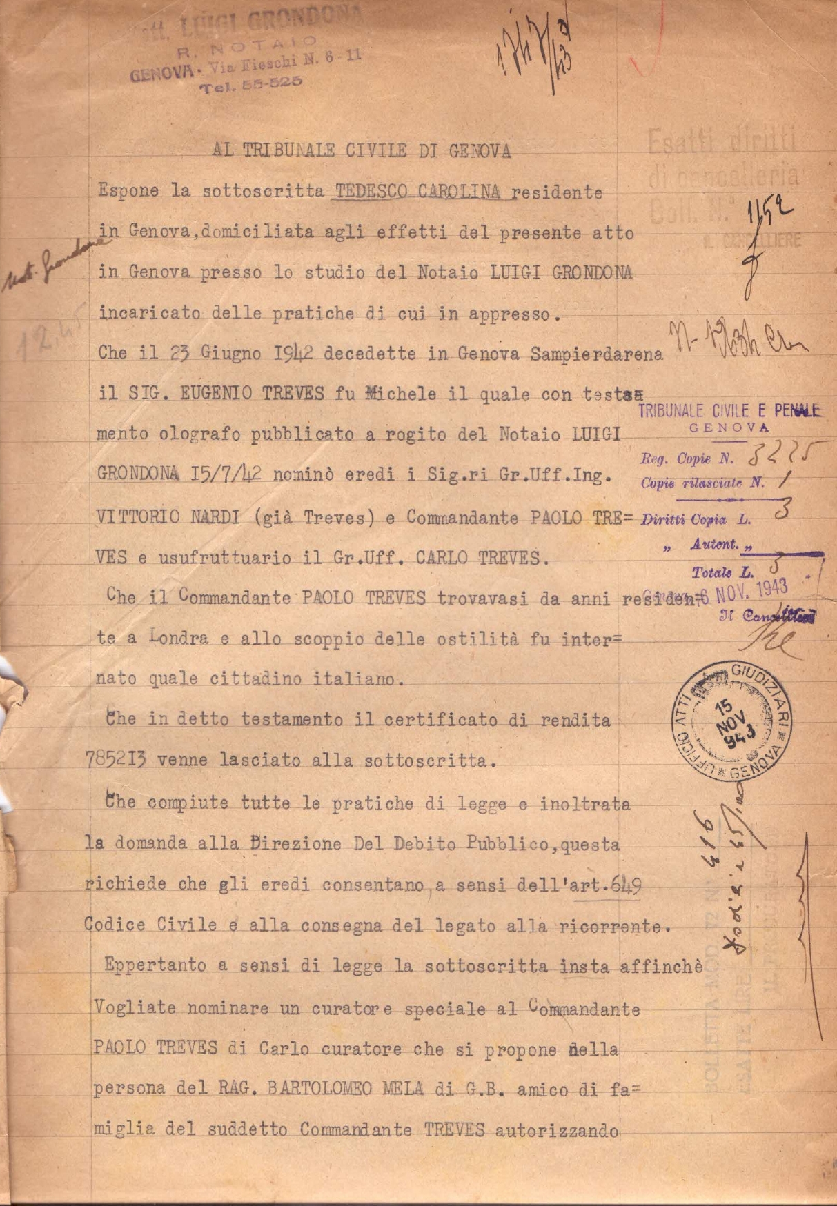 Il Rag. Bartolomeo Mela di G.B. curatore speciale del Comandante Paolo Treves di Carlo, residente a Londra ed ivi internato quale cittadino italiano, perché consenta, presso la Direzione del Debito Pubblico al tramutamento al portatore del certificato 785213 rendita 3,50% per la rendita di L. 1106 in favore della ricorrente Carolina Tedesco.