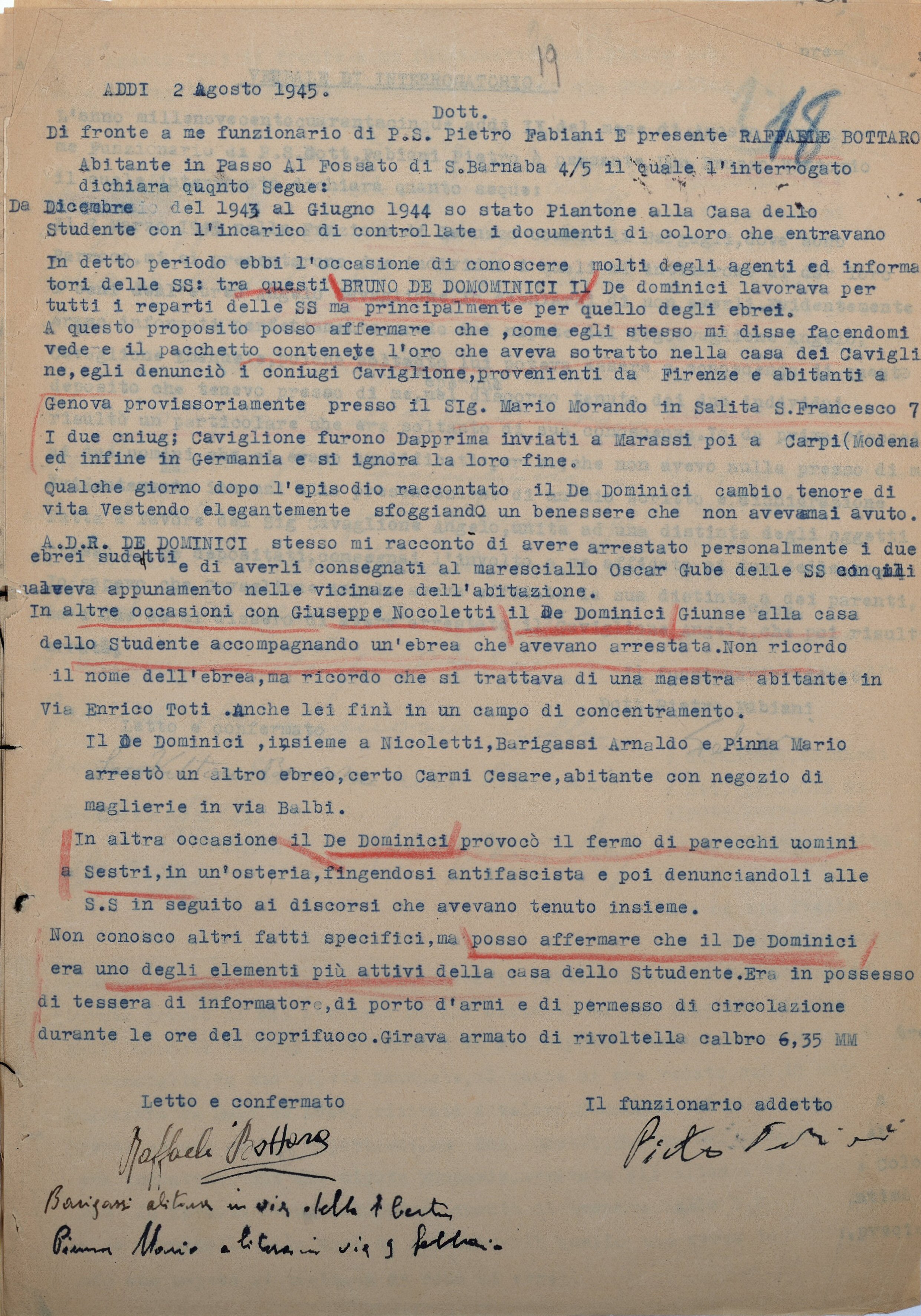 Il 5 ottobre, nell’Ufficio del Pubblico Ministero presso la Corte d’Assise Straordinaria, Raffaele Bottaro conferma la sua deposizione, aggiungendo il cognome della donna: