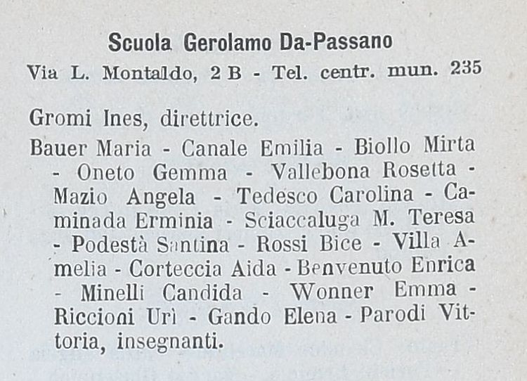 Nell’anno 1925-1926 Carolina Tedesco fa parte del corpo docente della scuola Gerolamo da Passano, come risulta dall’Annuario Genovese dei Fratelli Pagano di quell’anno.
