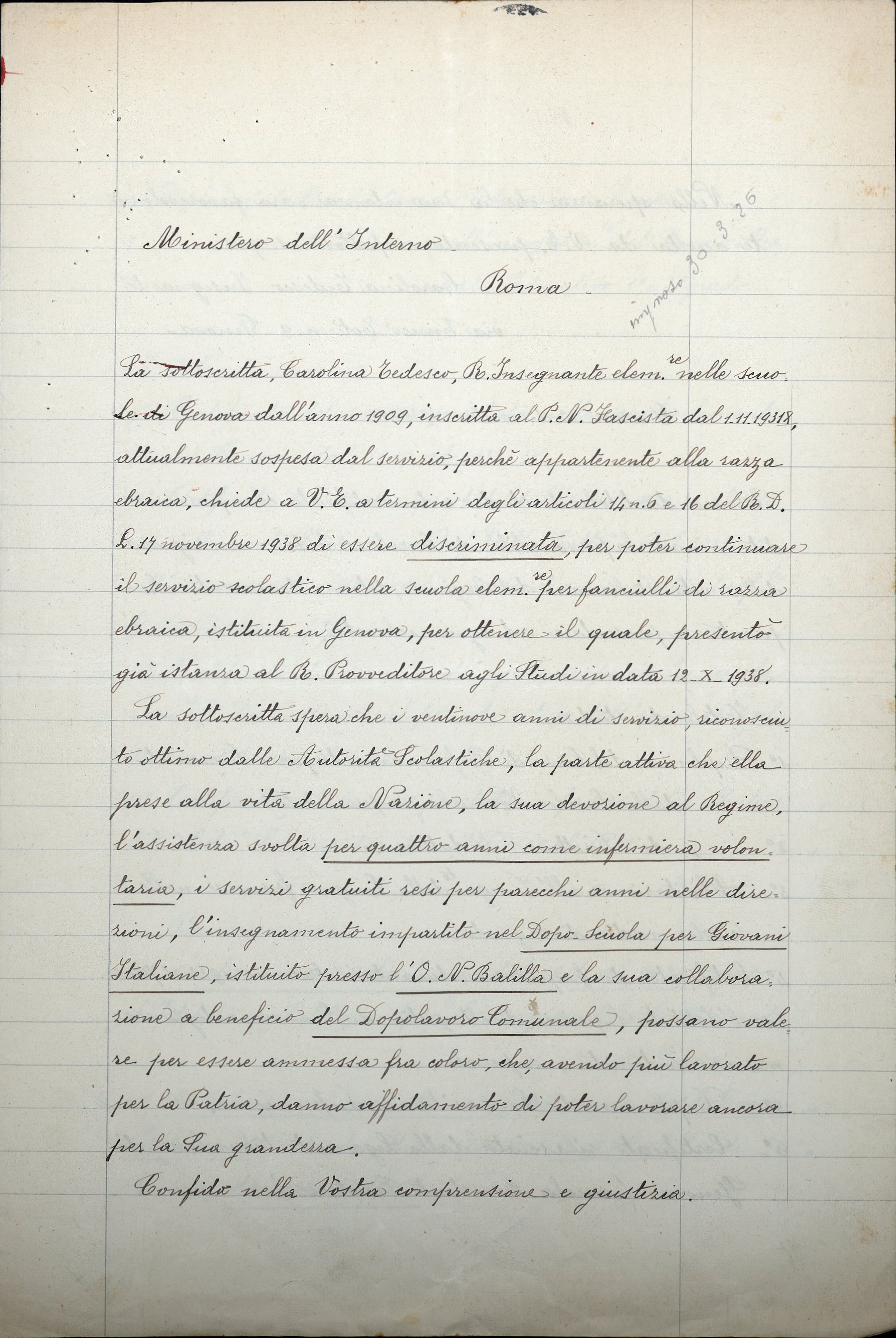 attualmente sospesa dal servizio, perché appartenente alla razza ebraica, chiede a V.E. a termini degli articoli 14 n. 6 e 16 del R.D.L. 17 novembre 1938 di essere discriminata, per poter continuare il servizio scolastico nella scuola elementare per fanciulli di razza ebraica, istituita in Genova, per ottenere il quale, presentò istanza al R. Provveditore agli Studi in data 12.X.1938.