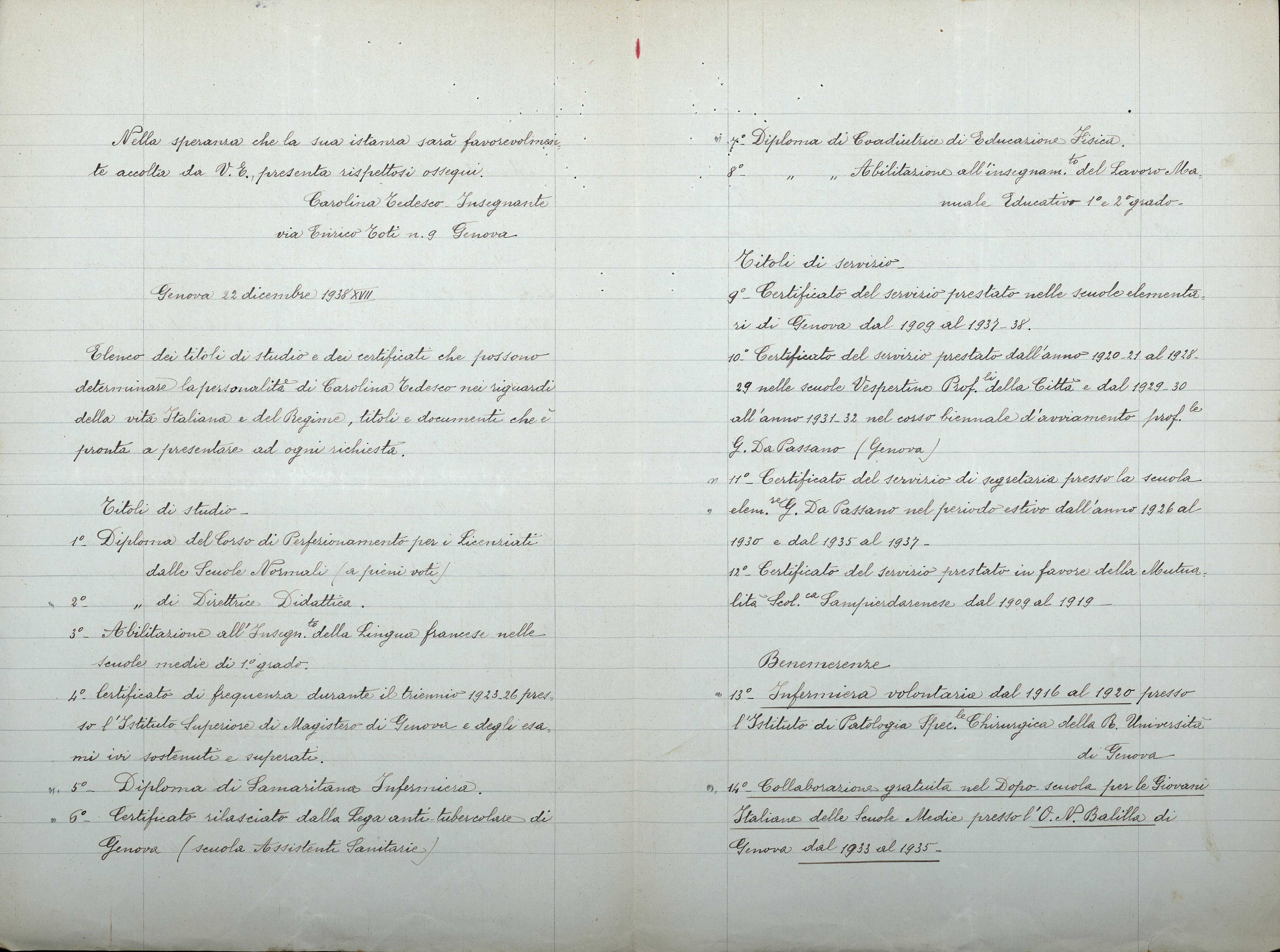 La sottoscritta, Carolina Tedesco, R. Insegnante elementare nelle scuole di Genova dall’anno 1909, inscritta al P.N. Fascista dal 1.11.1931 X,