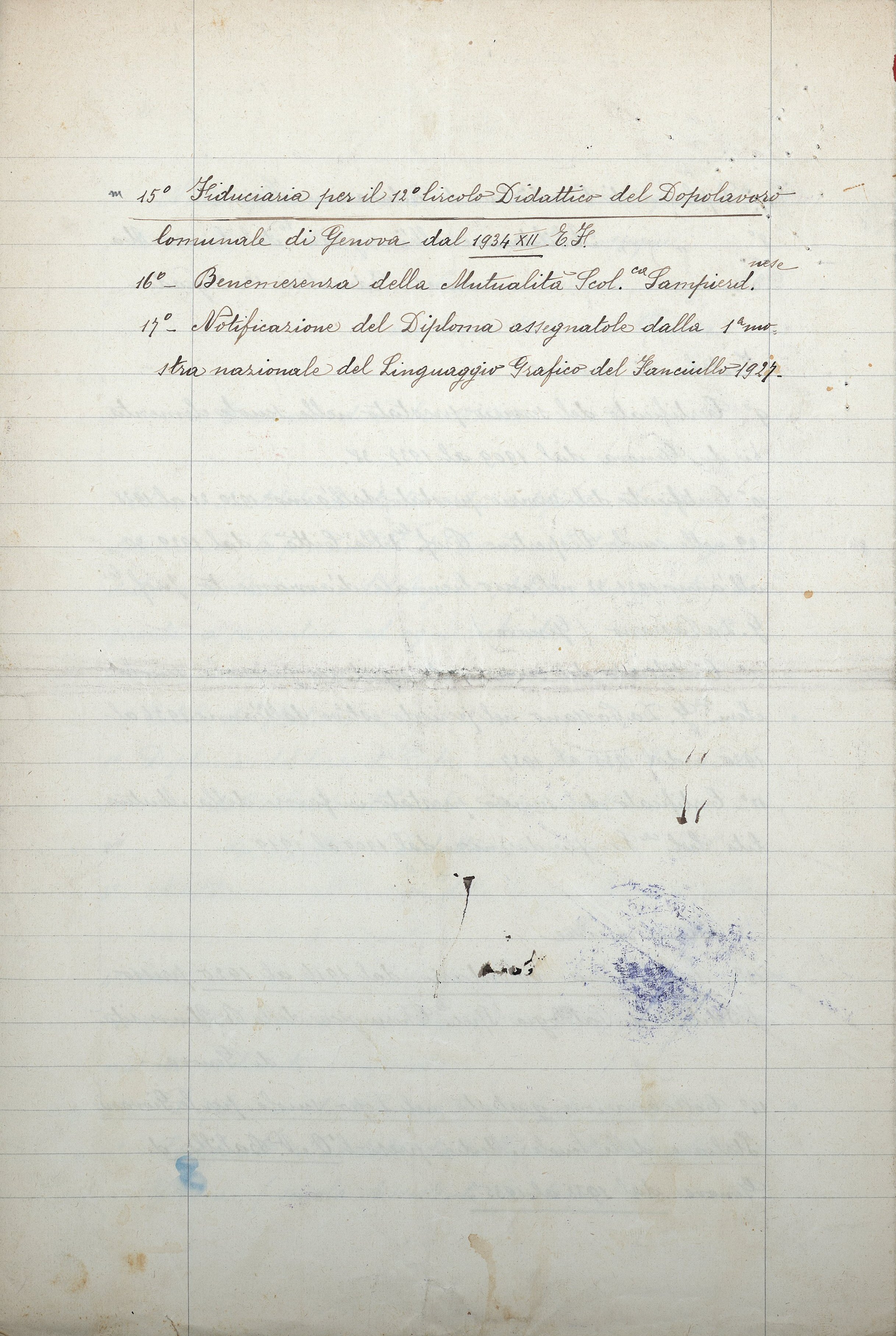 15°. Fiduciaria per il 12° Circolo Didattico del Dopolavoro Comunale di Genova dal 1934 XII E. F.